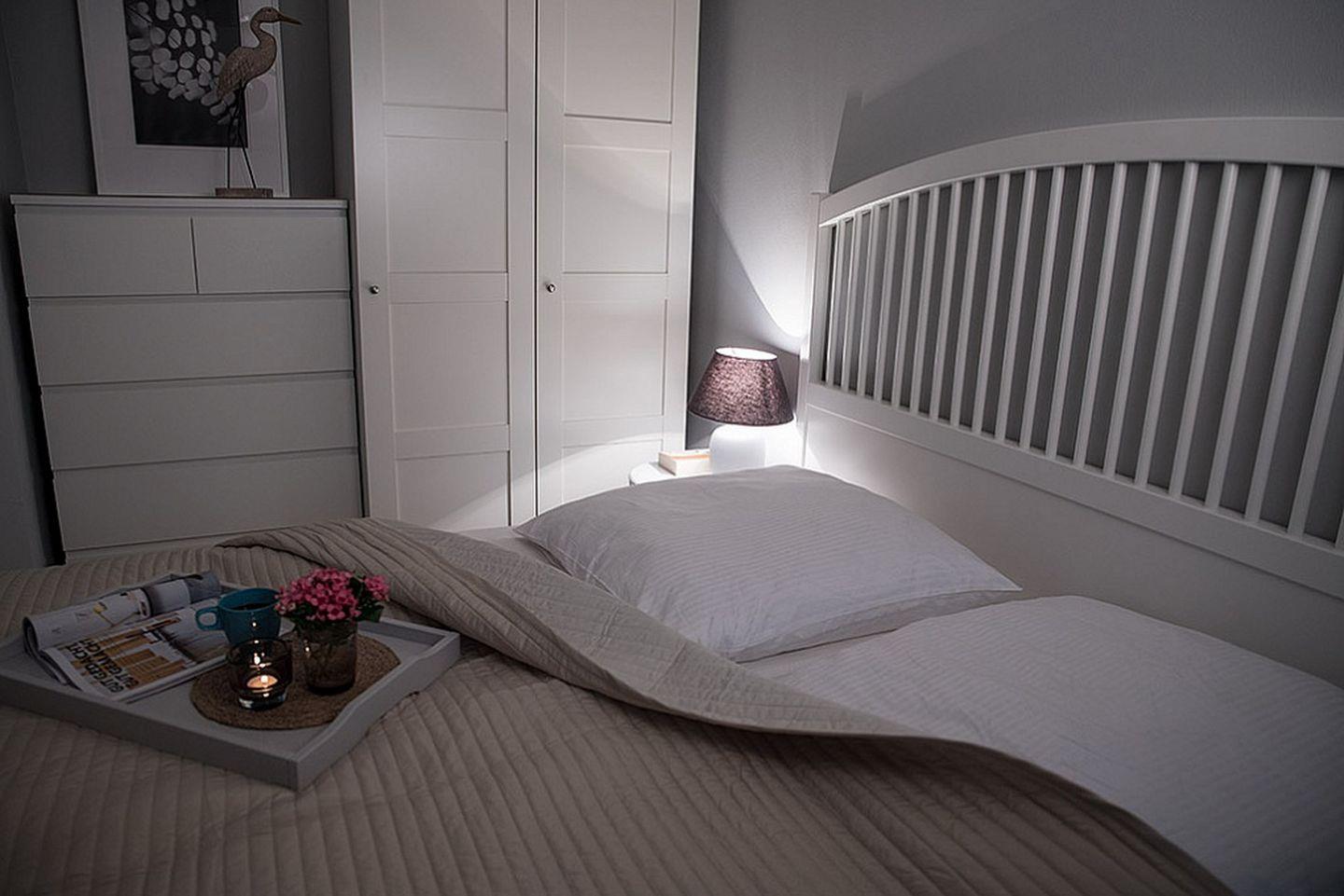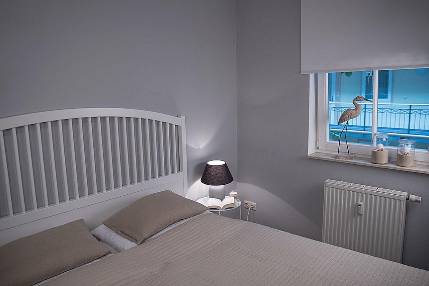 Im Schlafzimmer dieser Ferienwohnung lädt dich ein gemütliches Doppelbett (2 x 90 x 200 cm) zum erholsamen Schlaf ein. Vorhänge und ein Rollo dienen zum Verdunkeln. Ein Kleiderschrank und eine große Kommode bieten viel Stauraum (das Schlafzimmerfenster geht zum Atrium raus).