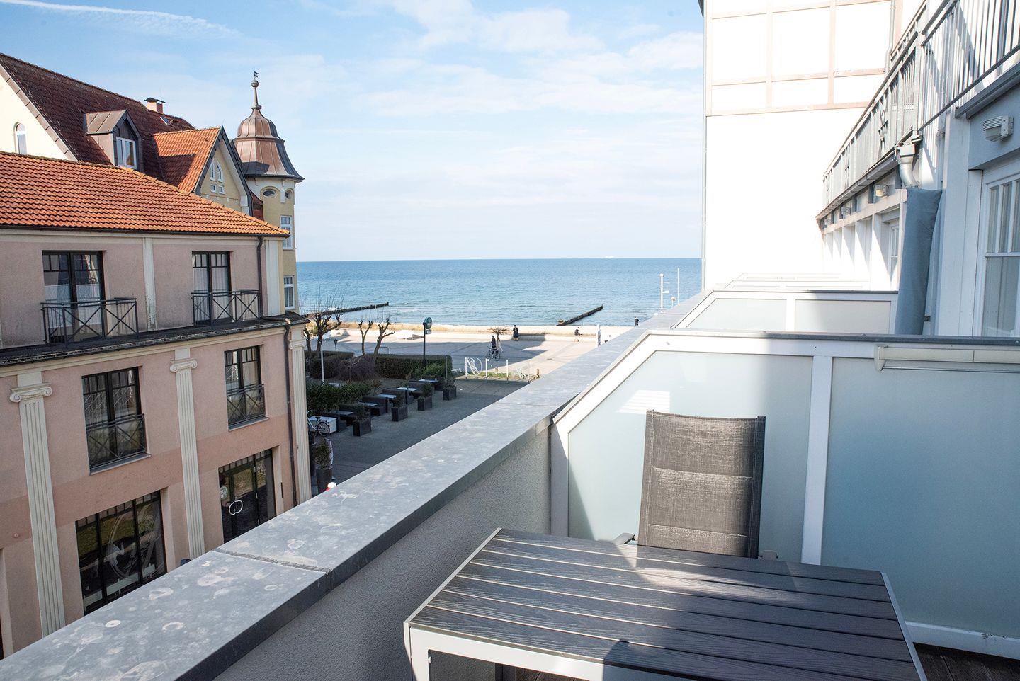 Die Ferienwohnung 218 im Haus Meeresblick ist eine 2-Zimmer-Wohnung im 2. OG mit einer Größe von etwa 45 m². Vom Balkon, haben Sie einen Teilseeblick auf die Ostsee.