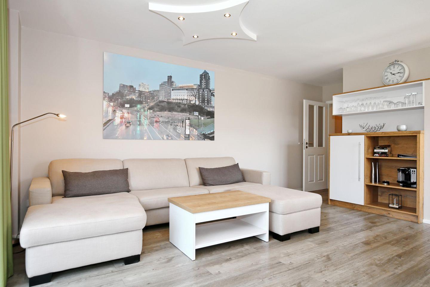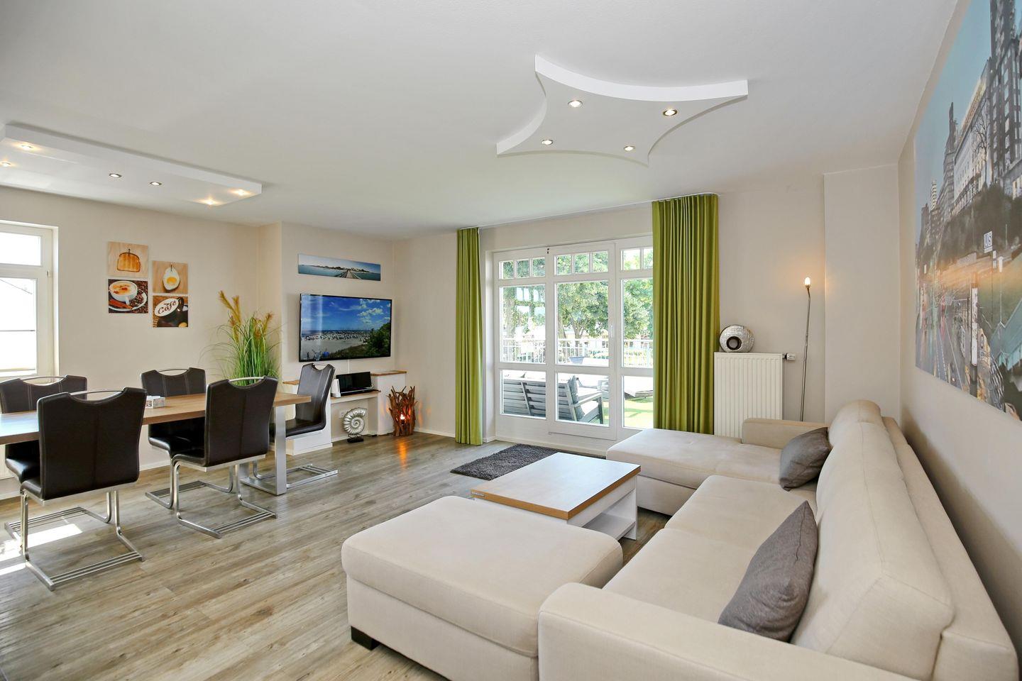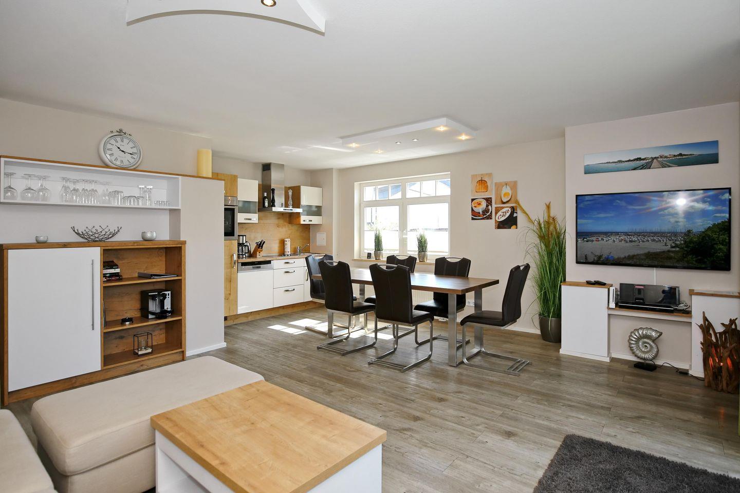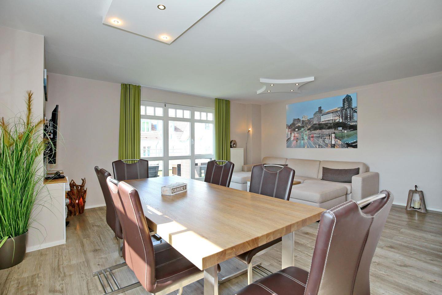 Der sehr großzügige und moderne Wohnraum der Ferienwohnung lädt mit einer gemütlichen Wohnlandschaft mit Schlaffunktion (160 cm x 200 cm) und einem modernen Flachbild-TV, einem DVD-Player und einer Spielekonsole (Wii-Konsole) zum Verweilen ein. Von hier aus gelangst du auf die großzügige Südterrasse. Am Esstisch hast du genügend Platz für gemeinsame Mahlzeiten.