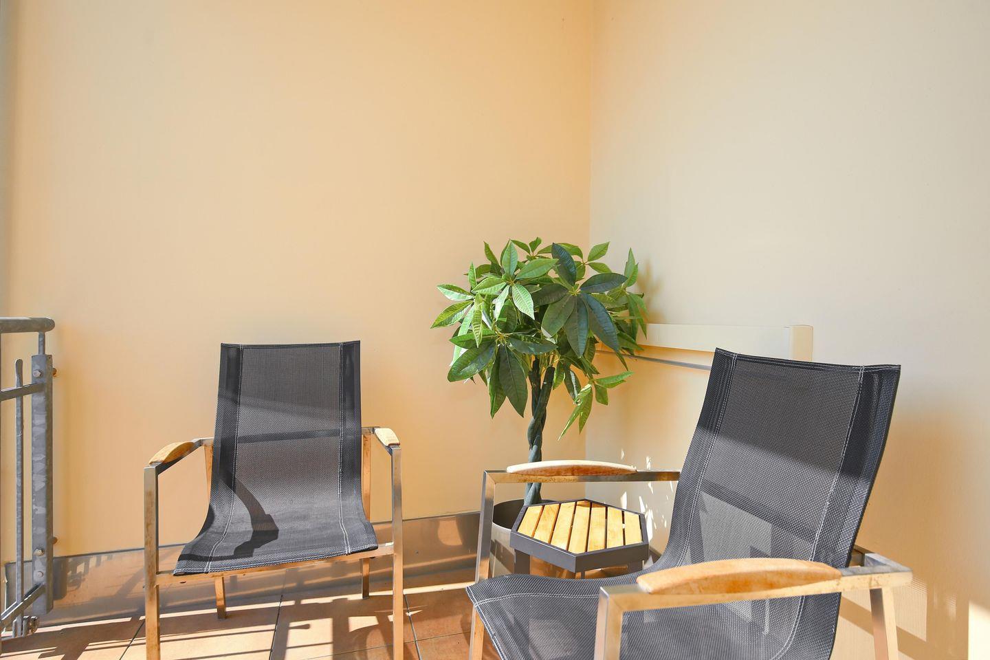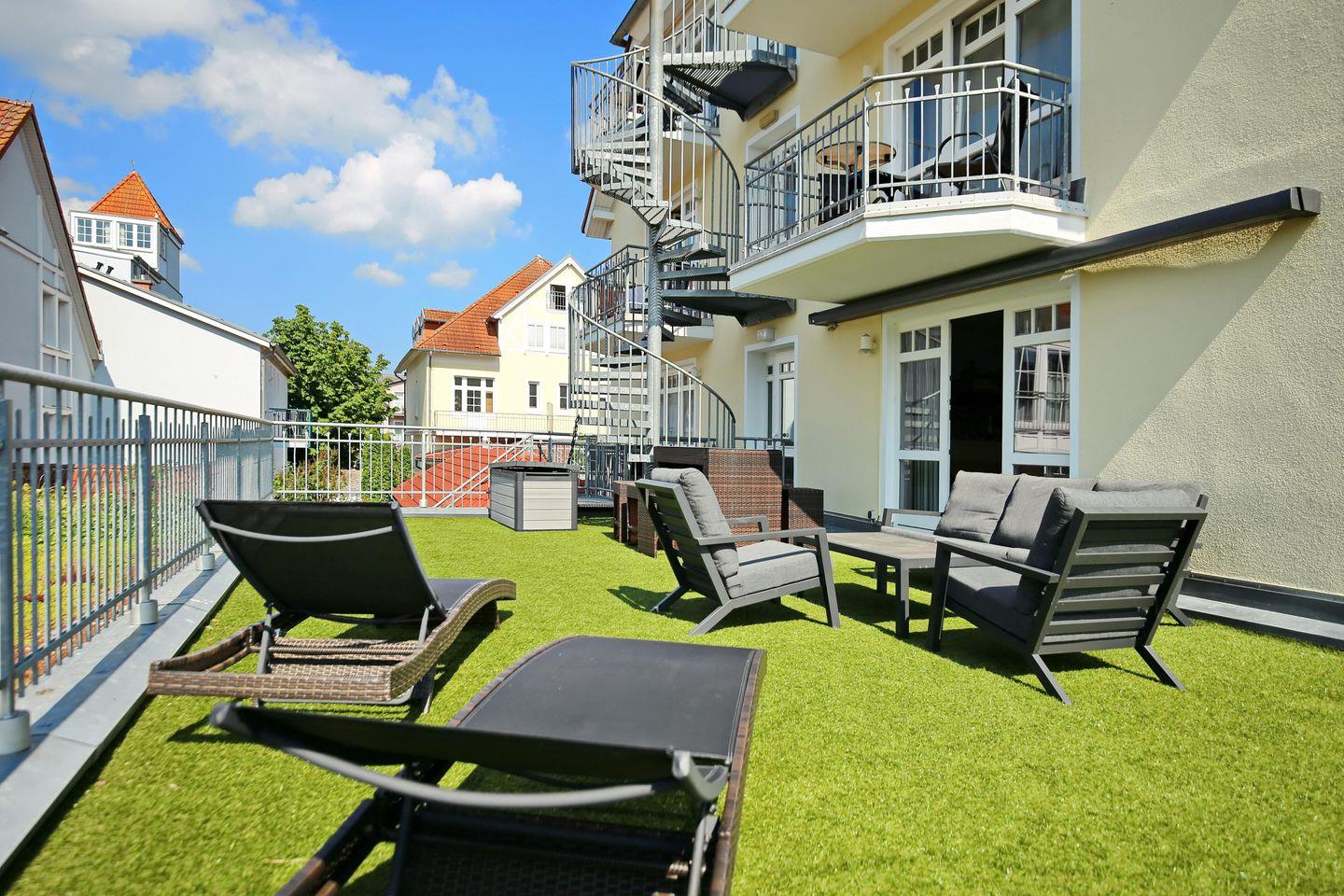 Deine Ferienwohnung befindet sich im 1. Obergeschoss und verfügt über eine 60 m² große Südterrasse mit teils seitlichem Meerblick sowie gemütlichen Loungemöbeln. Mit einer Wohnfläche von 83 m² bietet die Wohnung mit einem Wohn- und Essbereich, zwei geräumigen Schlafzimmern, einer Küchenzeile und einem Duschbad sowie einem Gäste-WC viel Platz für einen erholsamen und komfortablen Ostseeurlaub. Die Entfernung zum Strand beträgt etwa 100 Meter.