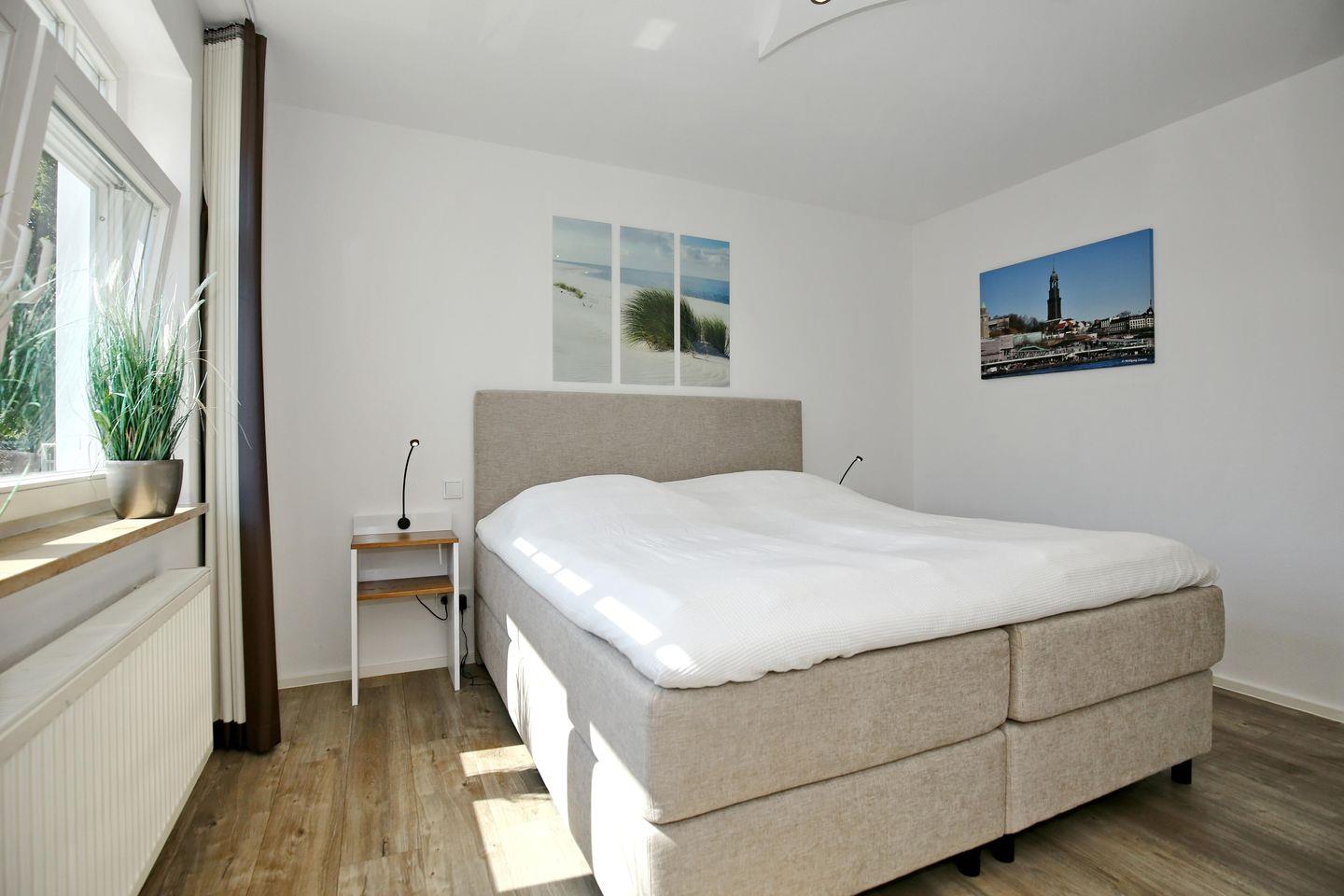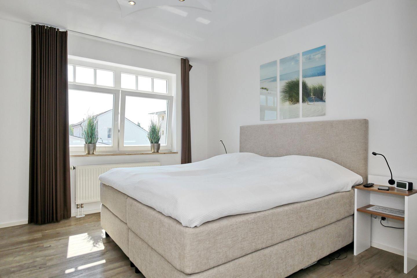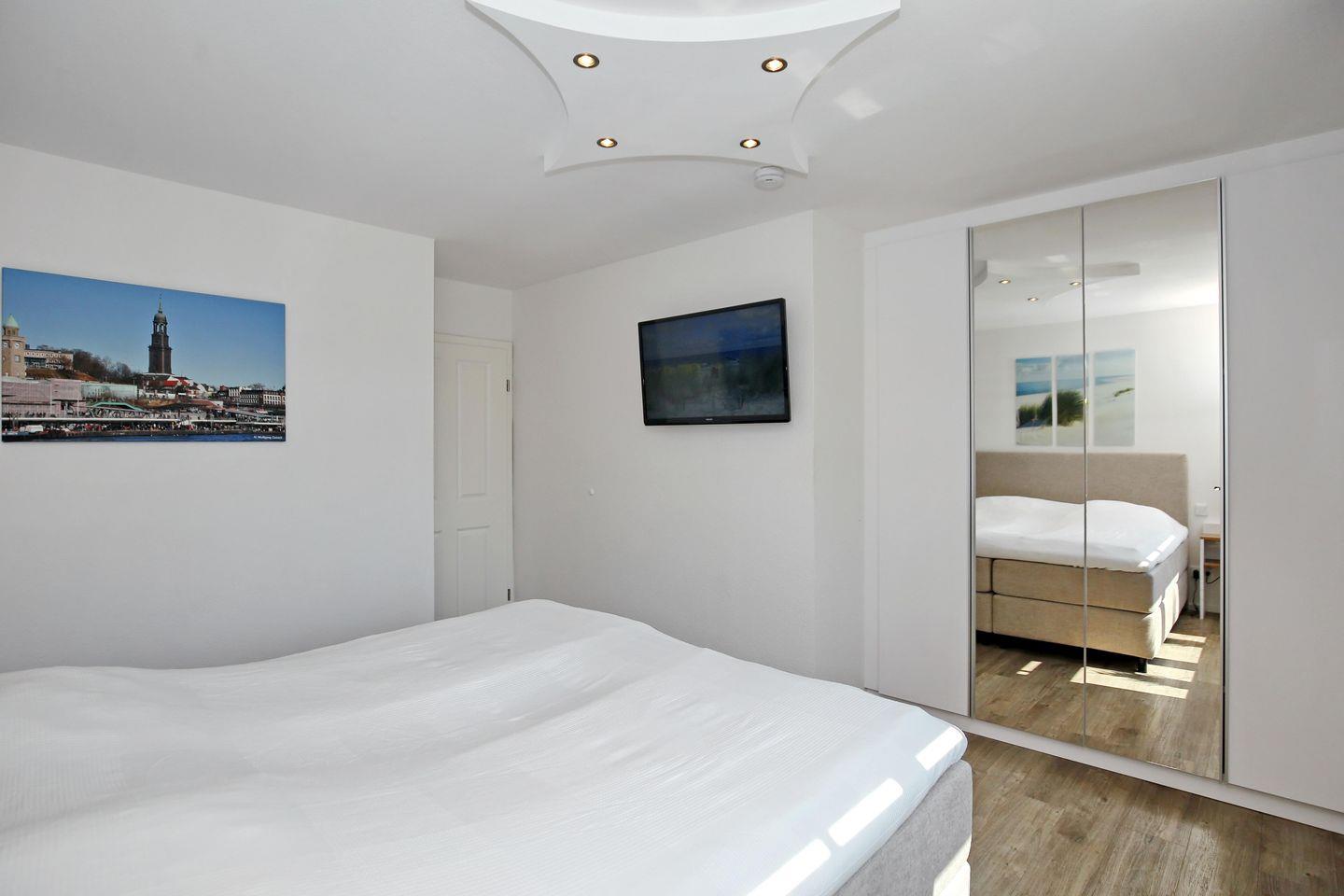 In den Schlafzimmern der Ferienwohnung lädt je ein gemütliches Boxspringbett (180 cm x 200 cm) zum erholsamen Schlaf ein. Die Schwebetürenschränke und Flachbild-Fernseher vervollständigen die ansprechende Ausstattung. Die Vorhänge an den Fenstern dienen dir zur Verdunklung. Von dem nordöstlich gelegenen Schlafzimmer erreichst du den kleinen Balkon mit Teilseeblick.