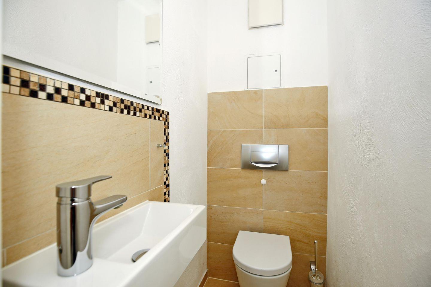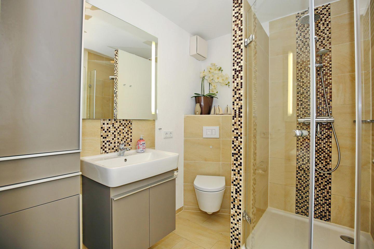 Die Ferienwohnung verfügt über ein gefliestes, sehr modernes Duschbad mit WC und ein Gäste-WC. Für deine Waschutensilien findest du genügend Ablagefläche. In der gesamten Wohnung wurde Vinyl-Boden verlegt. In dieser Nichtraucherwohnung sind Haustiere nicht erlaubt.