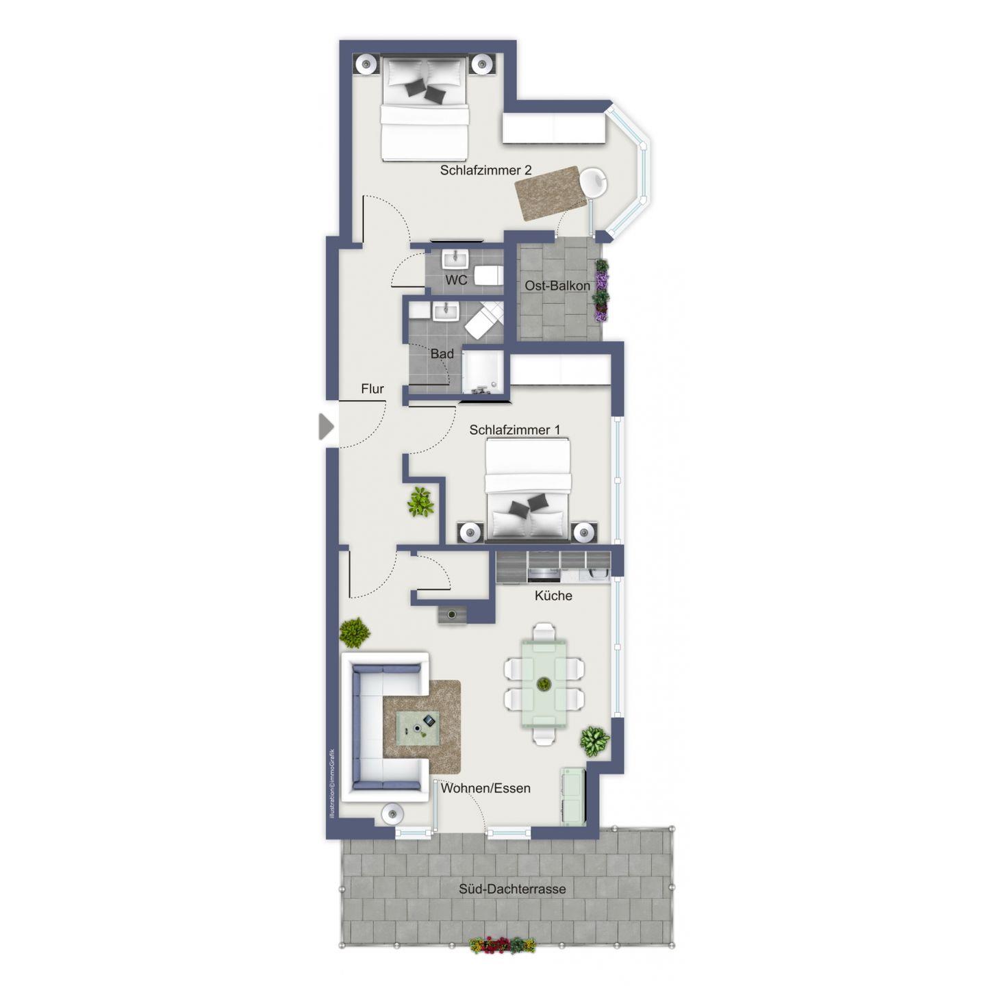 Die Ferienwohnung 306 in der Villa Hanse ist eine 3-Zimmer-Wohnung mit einer Wohnfläche von etwa 83 m². Zu der Wohnung gehört eine 60m² große Südterrasse.