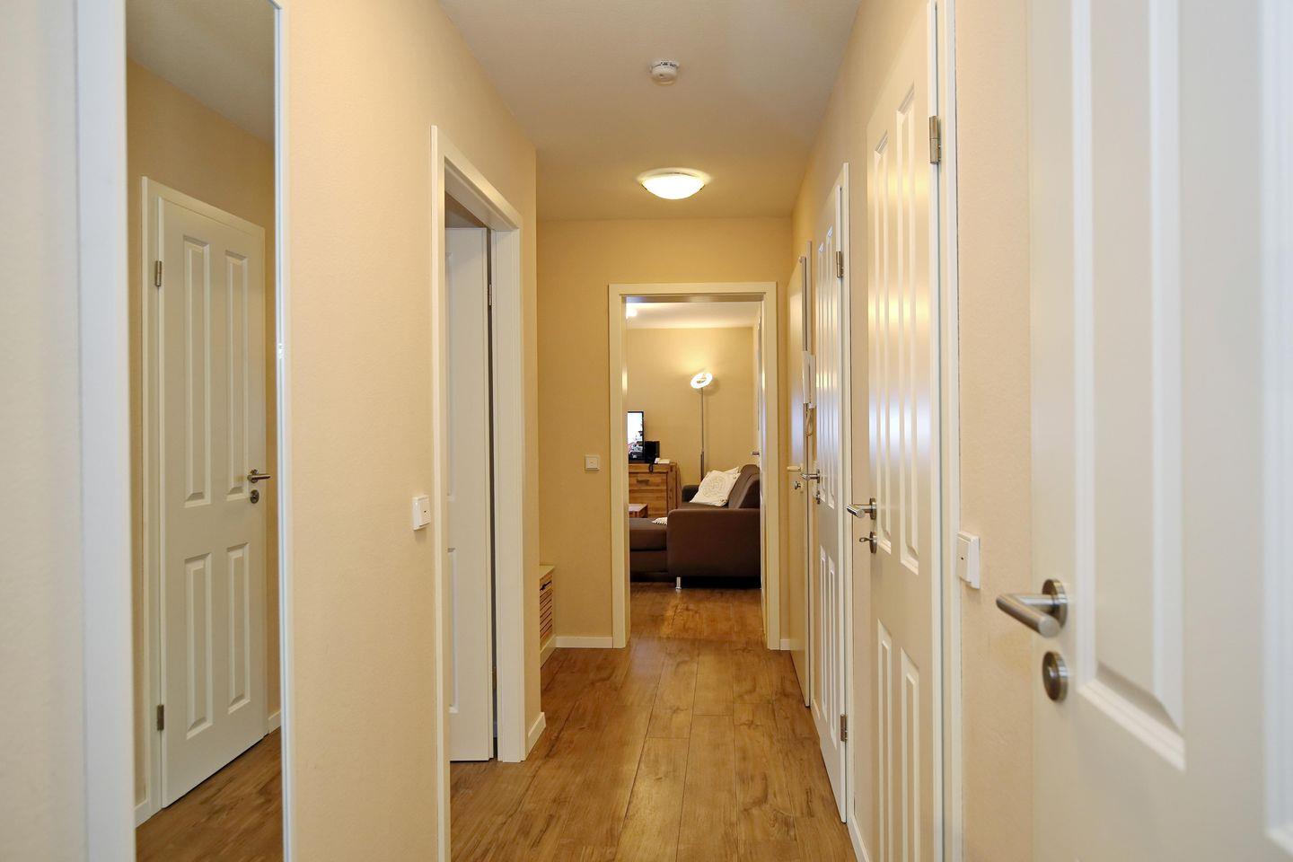 Deine Ferienwohnung befindet sich im 2. Obergeschoss. Mit einer Größe von 64 m² bietet die Wohnung mit einem Wohn- und Essbereich, zwei geräumigen Schlafzimmern, einer Küchenzeile und einem Duschbad sowie einem Gäste-WC viel Platz für einen erholsamen und komfortablen Ostseeurlaub. Die Entfernung zum Strand beträgt etwa 100 Meter.