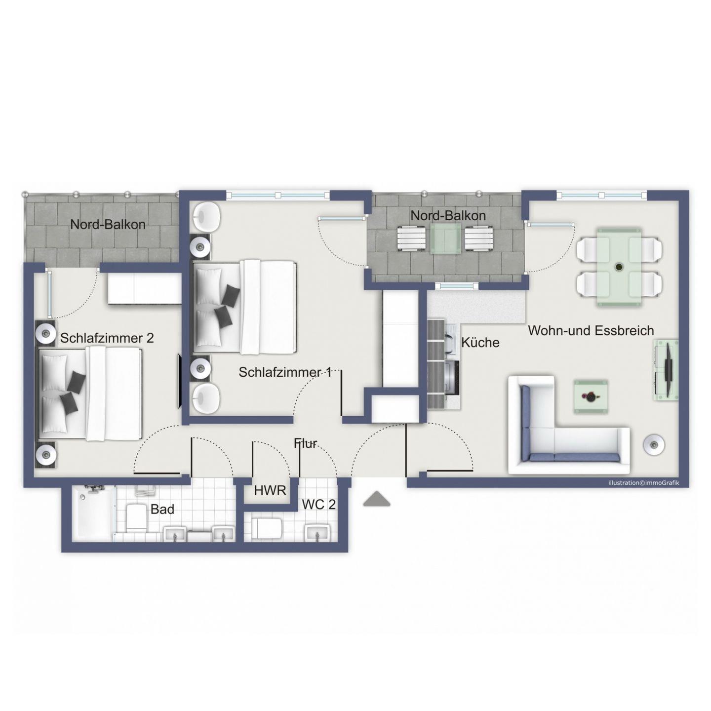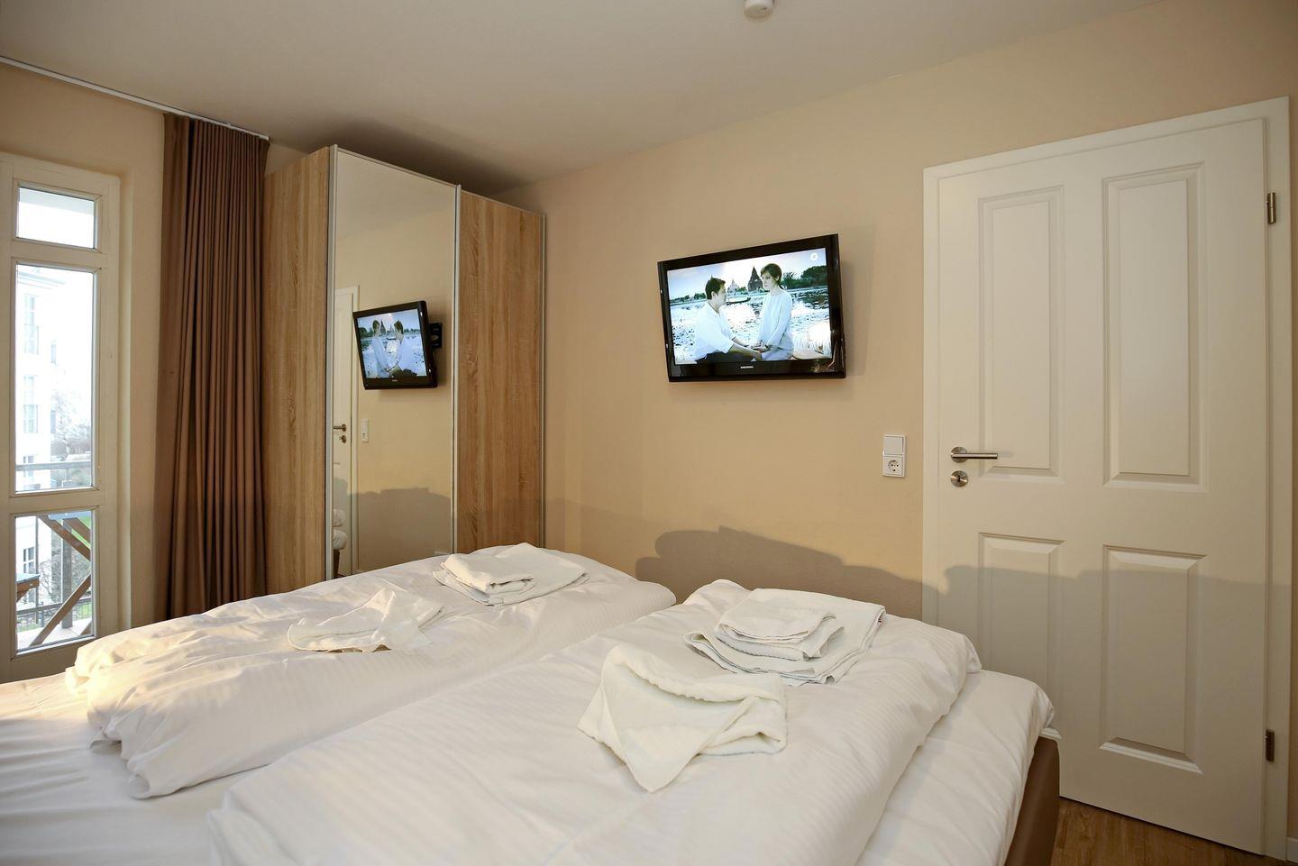 In den Schlafzimmern der Ferienwohnung lädt je ein gemütliches Boxspringbett (180 cm x 200 cm) zum erholsamen Schlaf ein. Die Schwebetürenschränke vervollständigen die ansprechende Ausstattung. Die Vorhänge an den Fenstern dienen dir zur Verdunklung. Von beiden Schlafzimmern aus gelangst du auf die Nordbalkone.