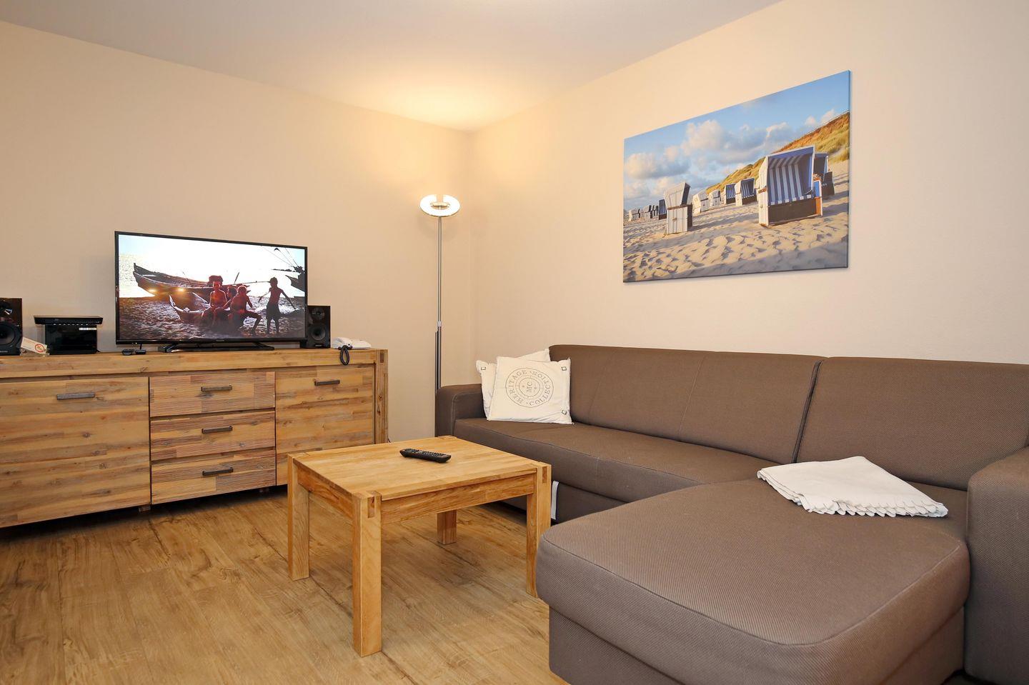 Der sehr moderne Wohnraum der Ferienwohnung lädt mit einer gemütlichen Schlafcouch (160 cm x 200 cm) und einem modernen Flachbild-TV sowie einer Stereo-Anlage zum Verweilen ein. Von hier aus gelangst du auf den Balkon zur Nordseite. Am Esstisch hast du genügend Platz für gemeinsame Mahlzeiten.