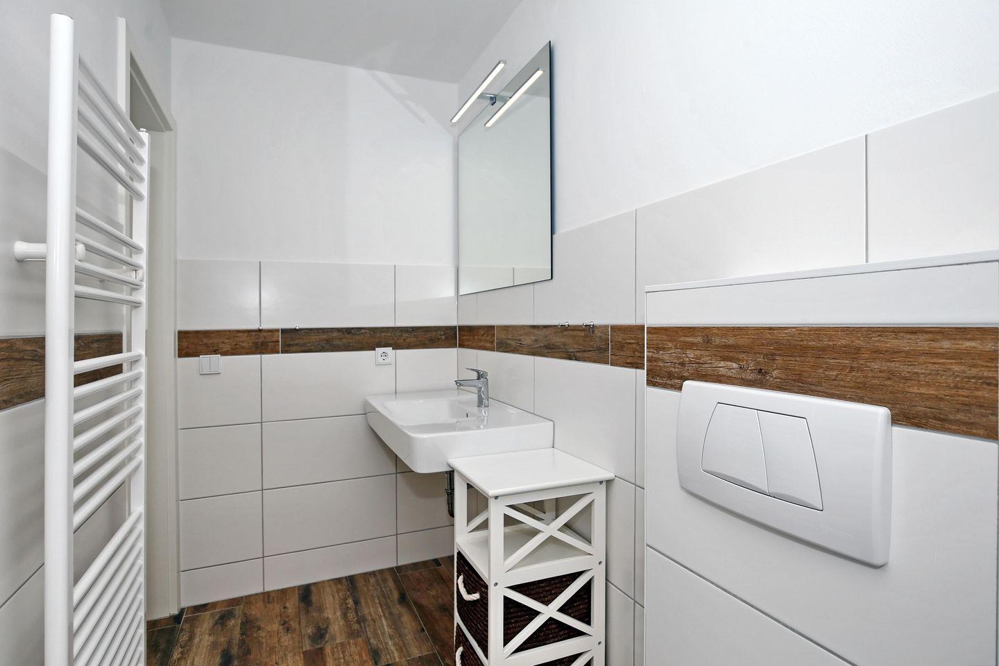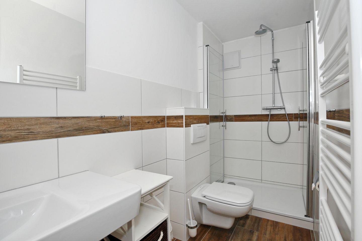 Die Ferienwohnung verfügt über ein gefliestes Duschbad mit WC und zwei Waschbecken sowie ein Gäste-WC. Für deine Waschutensilien findest du genügend Ablagefläche. In der gesamten Wohnung wurde ein Vinyl-Boden verlegt. In dieser Nichtraucherwohnung sind Haustiere nicht erlaubt.