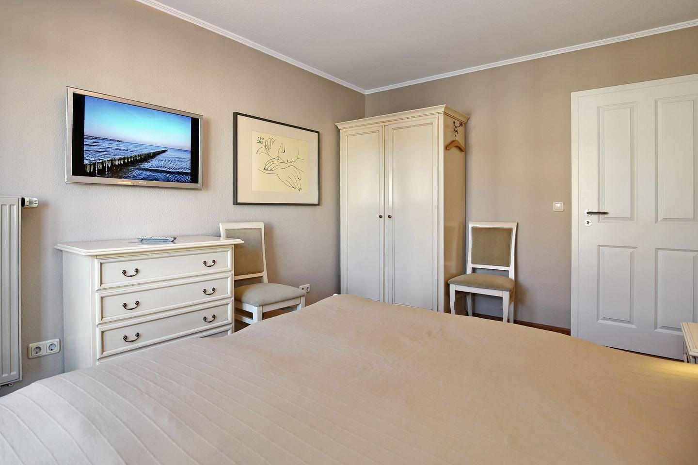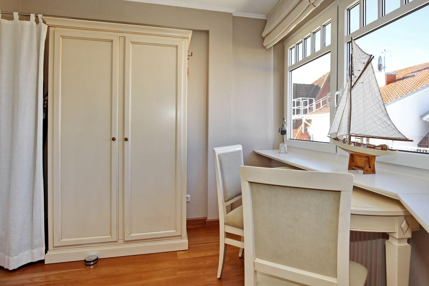 Das erste Schlafzimmer empfängt dich mit einem Doppelbett (2 x 90 cm x 200 cm), zwei Nachtschränkchen mit zwei Radio-Weckern, einem Kleiderschrank und einer Kommode. Über der Kommode befindet sich ein zusätzlicher Flachbild-TV. Von hier aus gelangst du auf den Nordbalkon mit Blick auf den Hafen und die Strandstraße. Im zweiten Schlafzimmer befinden sich ein Etagenbett (2 x 90 cm x 200 cm), ein geräumiger Kleiderschrank sowie vor dem Fenster ein Tisch mit zwei Stühlen. In beiden Schlafzimmern dienen dir Vorhänge an den Fenstern zur Verdunklung.