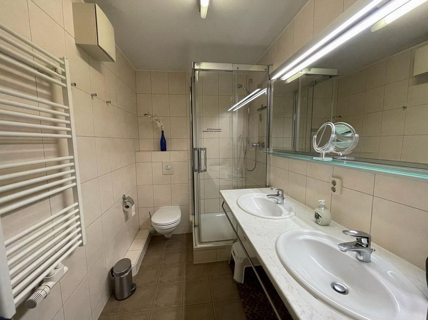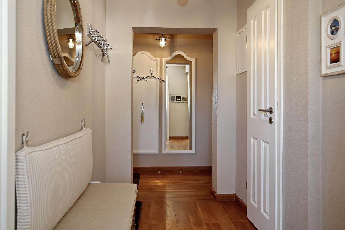 Die Ferienwohnung verfügt über ein Duschbad mit WC und zwei Waschbecken mit großem Spiegel sowie ein zusätzliches Gäste-WC. Auf dem Flur befinden sich zwei Garderoben und eine Sitzbank. Die gesamte Wohnung ist mit Ausnahme der Bäder mit einem Echtholzboden ausgestattet. In dieser Nichtraucherwohnung sind Haustiere nicht erlaubt.