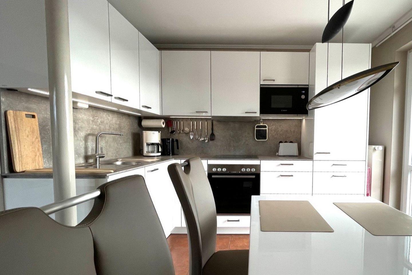 Die Küchenzeile ist für dich mit einem Kühlschrank, einem Geschirrspüler, einem 4-Platten-Cerankochfeld, einem Backofen und einer Mikrowelle voll ausgestattet. Vervollständigt wird die Küche durch einen Toaster, einen Wasserkocher, eine Kaffeemaschine und einen Eierkocher. Geschirr und Hausrat für den täglichen Bedarf sind selbstverständlich vorhanden. Der angrenzende Südbalkon ist mit einer Sonnenschutzmarkise ausgestattet.