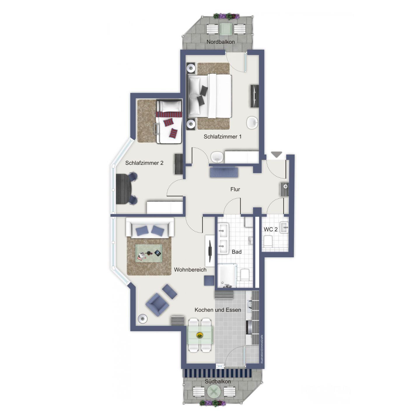Die Ferienwohnung 326 in der Villa Hanse ist eine 3-Zimmer-Wohnung mit einer Größe von etwa 58 m². Zu der Wohnung gehören zwei Balkone.
