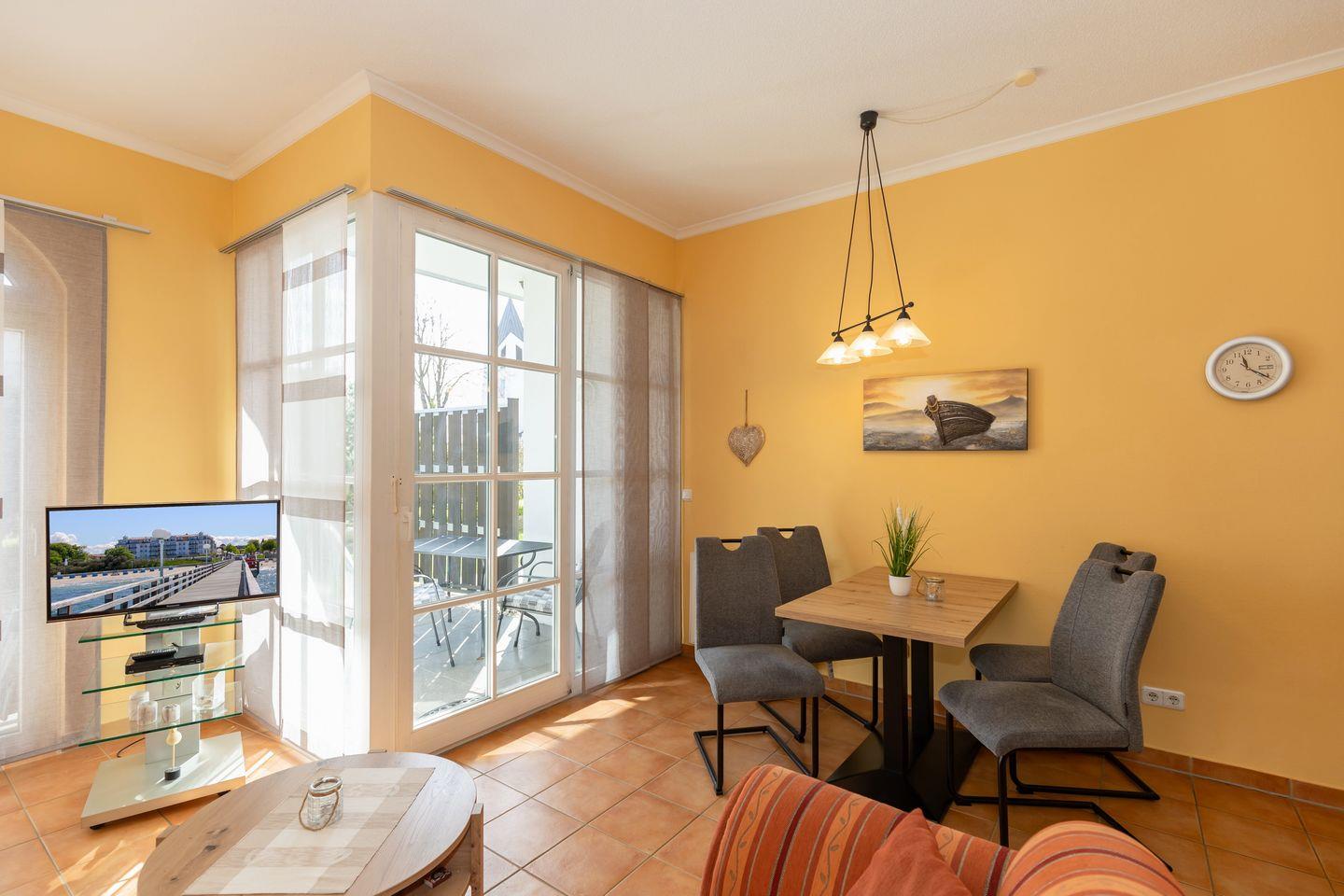Das helle und gemütliche Nichtraucher-Apartment verfügt über WLAN und eine voll ausgestattete offene Küche mit einem Backofen, einer Mikrowelle, einer Kaffeemaschine, einem Wasserkocher und einer Geschirrspülmaschine. Im kombinierten Wohn- und Essbereich stehen euch eine HiFi-Anlage und ein LCD-Flachbild-TV, DVD Player und ein Minisafe zur Verfügung. Sowohl der Esstisch, als auch der behagliche Sitzbereich bieten genügend Platz, um schöne Stunden beim Frühstück oder nach einem ereignisreichen Tag am Strand zu verbringen. Das separate Schlafzimmer ist ausgestattet mit einem großen Doppelbett und TV. Ein Kinderbett kann gegen Entgelt aufgestellt werden und auf Wunsch könnt ihr einen Hochstuhl hinzubuchen. Auf der nach Süd-Ost gelegenen Terrasse mit Blick auf einen Spielplatz, könnt ihr den ganzen Tag die Sonne und das milde Klima der Ostsee genießen.
