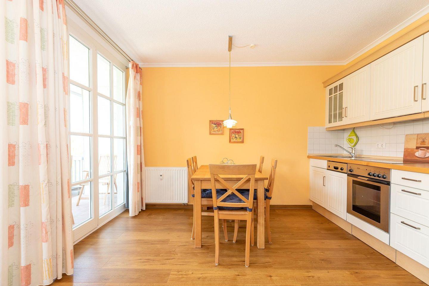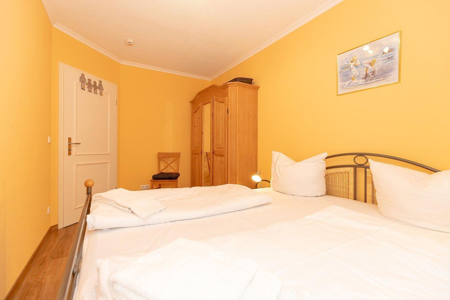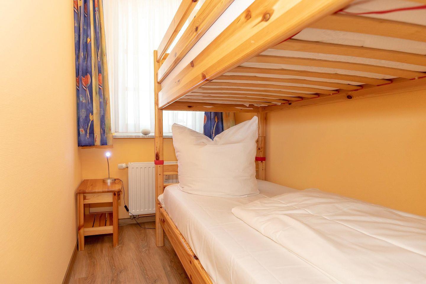 Die Ferienwohnung ist mit Teppichboden ausgestattet und besteht aus 2 Schlafzimmern mit Doppelbett bzw. einem Etagenbett, einem Wohnbereich mit Doppelschlafcouch und einer Loggia mit seitlichem Meerblick Richtung Seebrücke.
