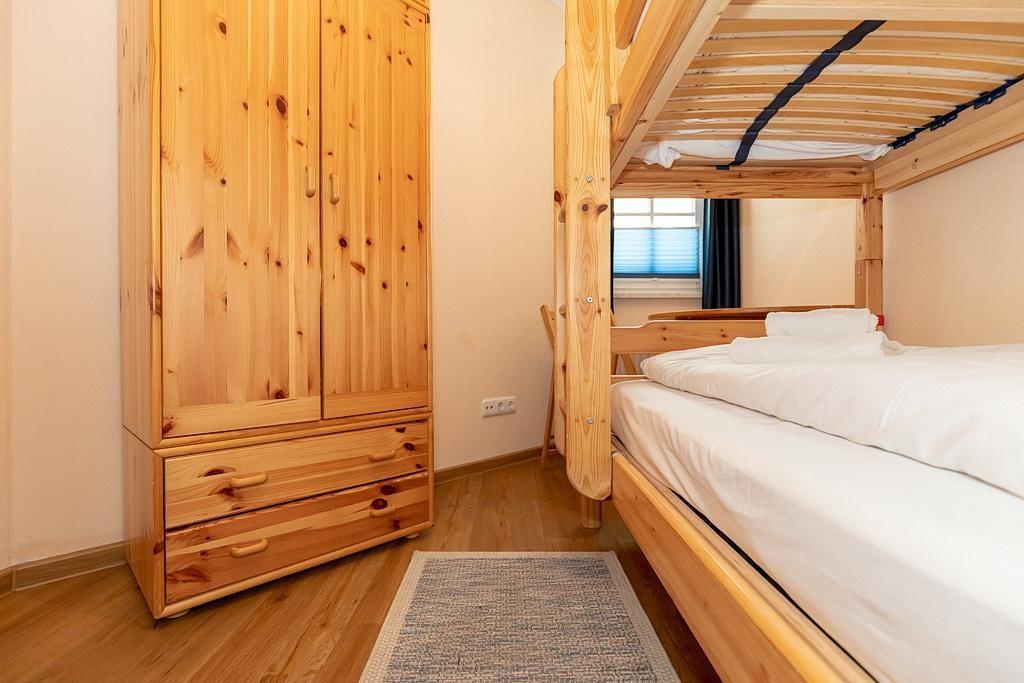 Zum Apartment gehören 2 Schlafbereiche, mit Laminat ausgelegt, Boxspringbett (1,80 x 2,00) mit Topper bzw. Etagenbett und verstellbarem Lattenrost und ein Wohnbereich mit Süd-West-Balkon. Der Balkon mit seitlichem Meerblick liegt Richtung Seebrücke bzw. Strandpromenade.