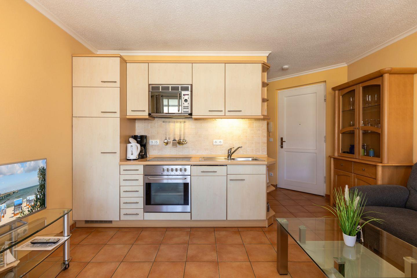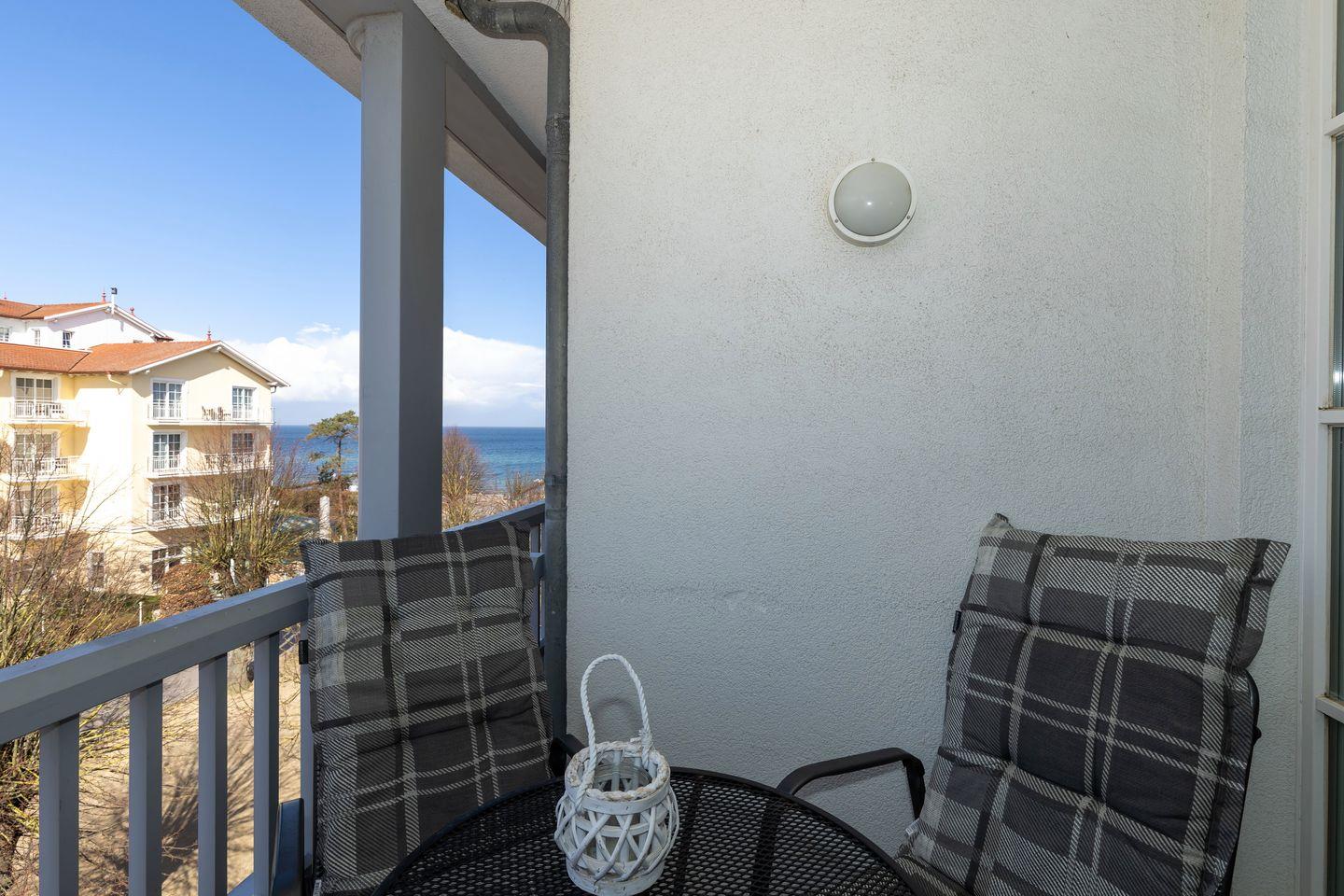Die Ferienwohnung besteht aus einem zum Innenhof liegenden Schlafbereich mit Doppelbett inklusive verstellbarem Lattenrost und aus einem gefliesten Wohnbereich mit Balkon, der euch einen seitlichen Blick auf die Ostsee und Seebrücke ermöglicht.