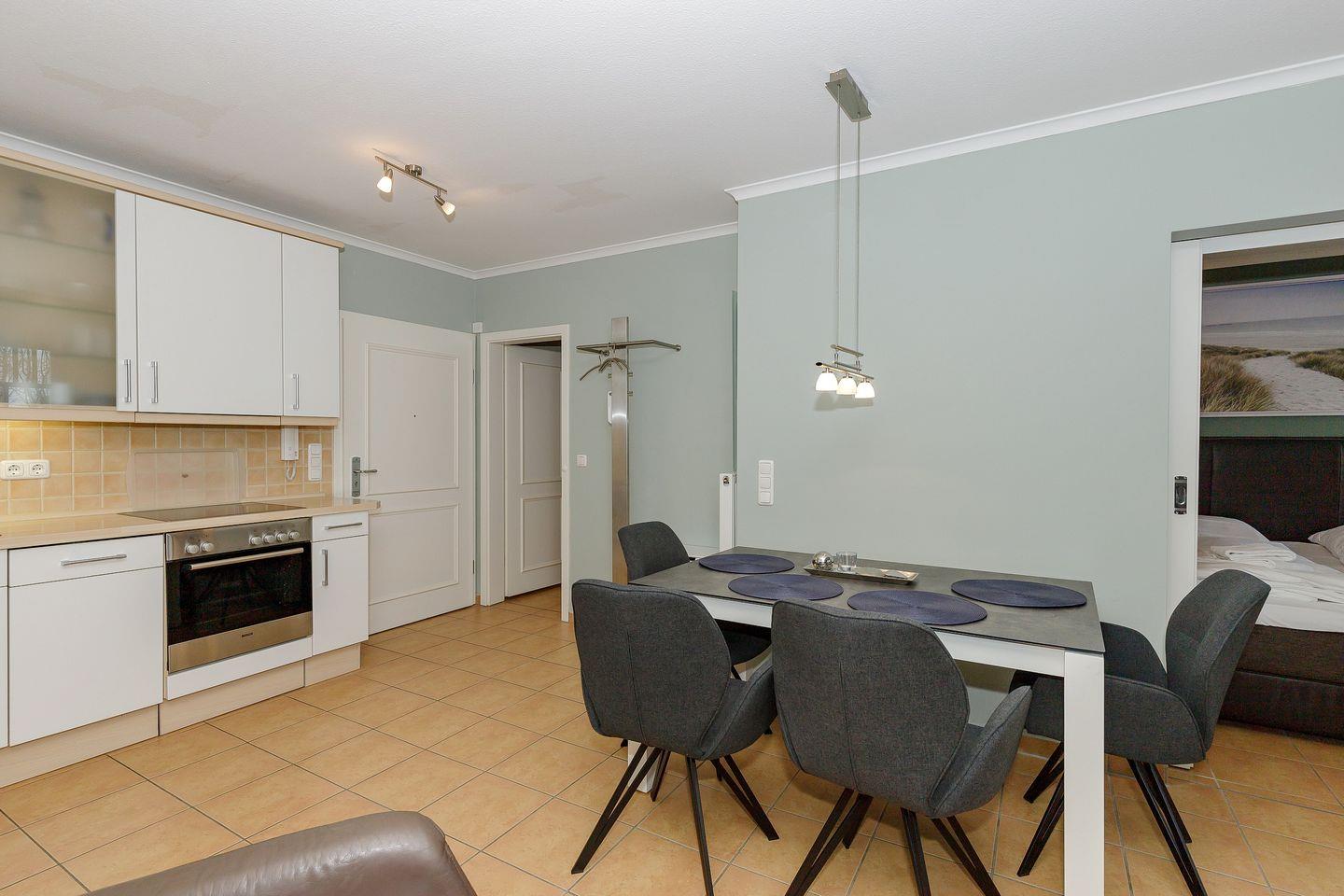 Das liebevoll gestaltete Nichtraucher-Apartment ist durchgängig gefliest und verfügt über bodentiefe Fester, kostenfreies WLAN und eine voll ausgestattete offene Küche mit Geschirrspüler, Kühlschrank mit Gefrierfach, Kaffeemaschine, Toaster, Wasserkocher, Backofen und Mikrowelle sowie über einen Essbereich. Im angrenzenden Wohnbereich befindet sich eine hochwertige Ledersitzgruppe und ein Flatscreen-TV. Zwei separate Schlafzimmer stehen euch zur Verfügung und sind mit einem modernen Boxspringbett (1,80 x 2,00 m) bzw. mit einem Etagenbett für zwei Personen ausgestattet.