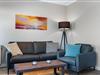 Der gemütliche Wohnbereich mit Flatscreen-TV bietet direkten Zugang zum Balkon mit direktem Meerblick.