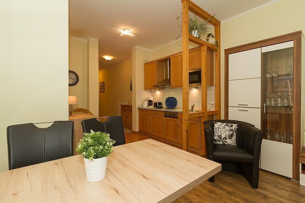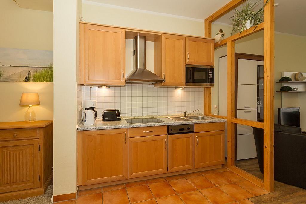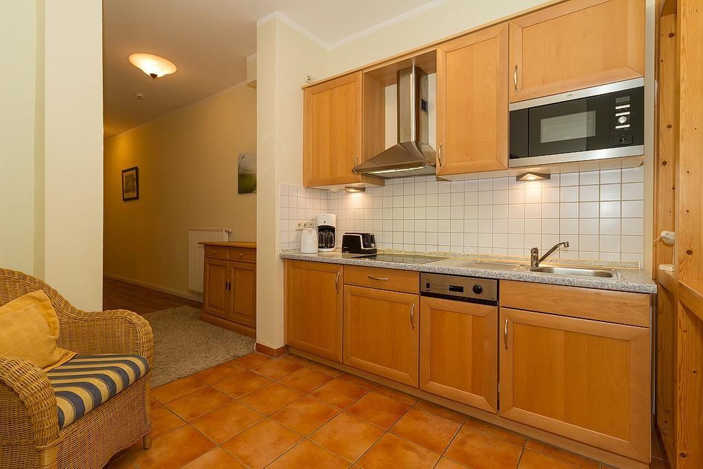 Das freundlich eingerichtete Nichtraucher-Apartment verfügt über kostenfreies WLAN und eine voll ausgestattete offene Küche mit Geschirrspüler, Mikrowelle inklusive Grillfunktion, Wasserkocher, Kaffeemaschine, Toaster und Tiefkühlfach. Der kombinierte Wohn- und Essbereich verfügt über eine TV-HiFi-Anlage mit Flachbild-TV. Sowohl der Esstisch, als auch der behagliche Sitzbereich mit Schlafcouch bieten genügend Platz, um schöne Stunden beim Frühstück oder nach einem ereignisreichen Tag am Strand zu verbringen. Das separate Schlafzimmer ist ausgestattet mit einem großen Boxspringbett (2 x 0,90 x 2,00). Das Schlafzimmerfenster liegt zum Atrium, dem begrünten, überdachten Innenhof des Gebäudes. Auf der nach Osten gelegenen Terrasse genießt ihr das Meeresklima der Ostsee.