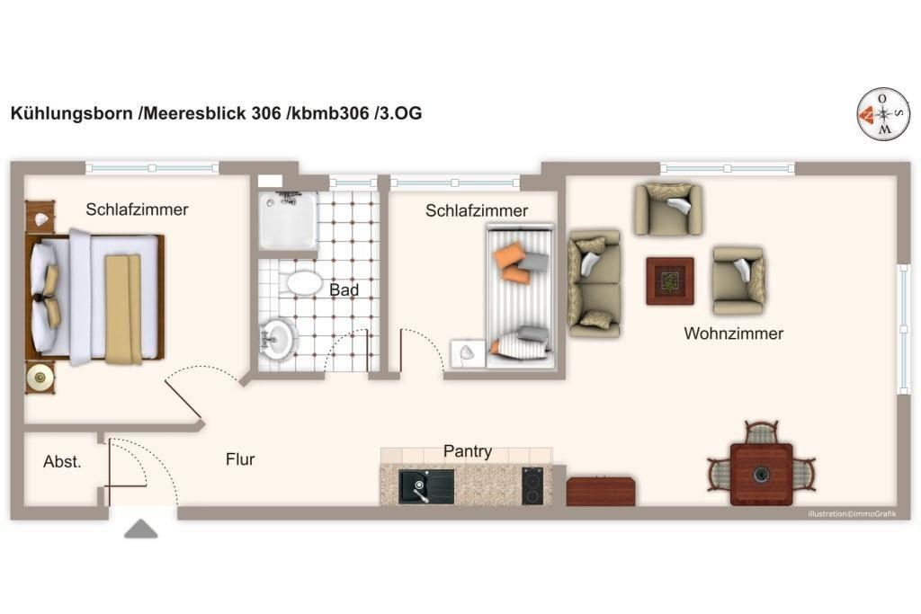 Das 56 m² große 3-Zimmer-Apartment ist für bis zu 4 Personen geeignet. Besonders hervorzuheben ist die direkte Strandlage der Apartmentanlage. Von hier erreicht ihr in wenigen Gehminuten den Strand und die Promenade.