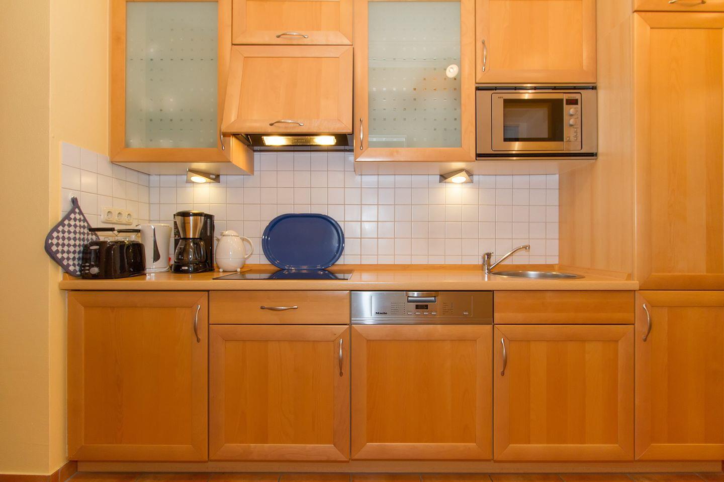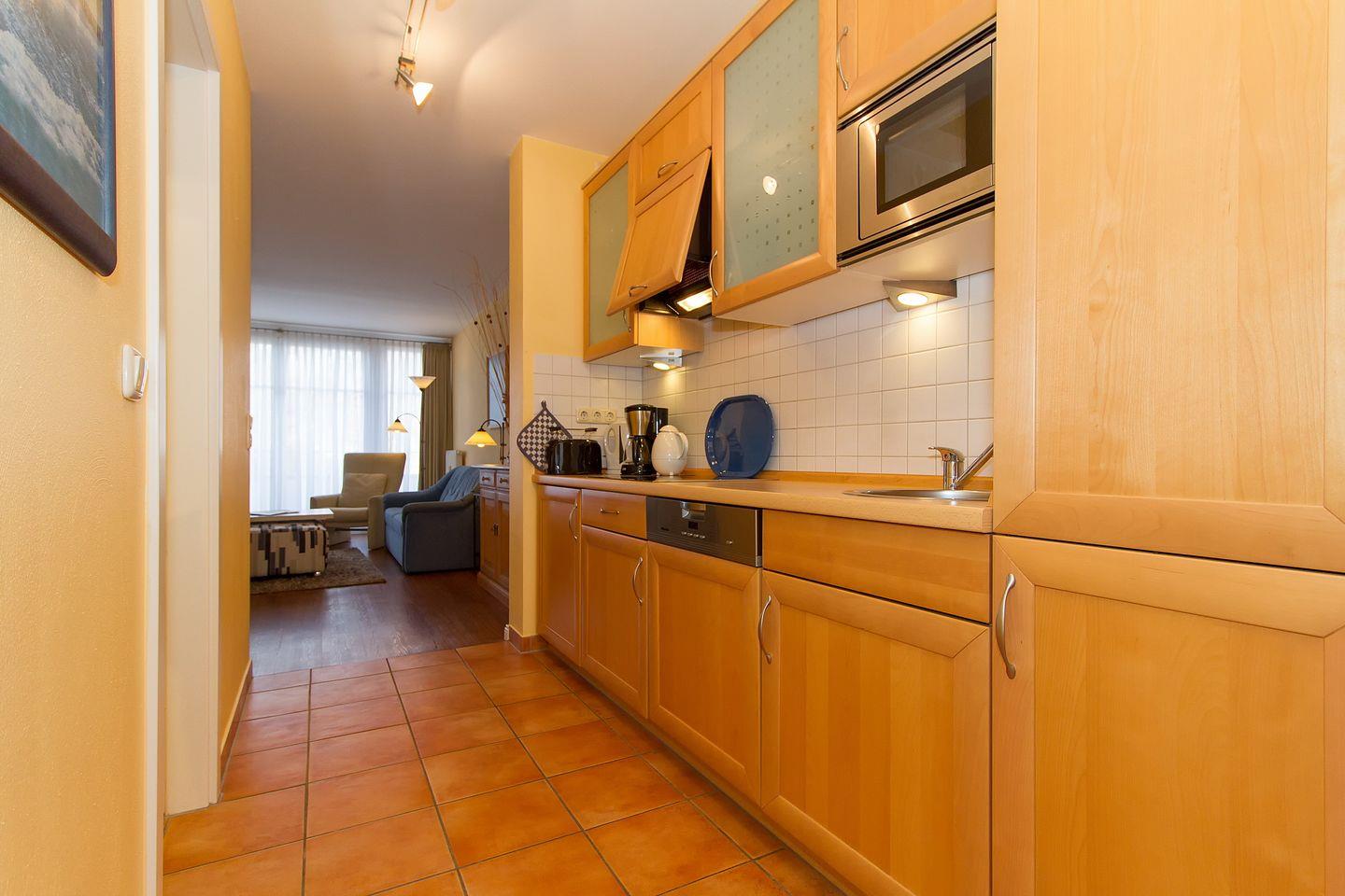 Das gemütliche Nichtraucher-Apartment verfügt über kostenfreies WLAN und eine voll ausgestattete offene Küche mit Geschirrspüler, Mikrowelle, Glaskeramik-Kochfeld mit 4 Kochzonen, Wasserkocher, Kaffeemaschine und Toaster. Der kombinierte Wohn- und Essbereich verfügt über eine TV-HiFi-Anlage mit Flachbild-TV (49 Zoll), Blue-Ray-Player und eine Doppelschlafcouch. Sowohl der Esstisch, als auch der behagliche Sitzbereich bieten genügend Platz, um schöne Stunden beim Frühstück oder nach einem ereignisreichen Tag am Strand zu verbringen. Überdies verfügt die Ferienwohnung über ein Bügeleisen, ein Bügelbrett, einen Föhn und einen Mini-Safe. Das separate Schlafzimmer ist ausgestattet mit einem großen Doppelbett (2 x 0,90 x 2,00). Das Schlafzimmerfenster liegt zum Atrium, dem begrünten, überdachten Innenhof des Gebäudes. Vom Balkon habt ihr einen seitlichen Blick auf die Ostsee. Der Balkon ist vom Wohn-/ Essbereich zugänglich.