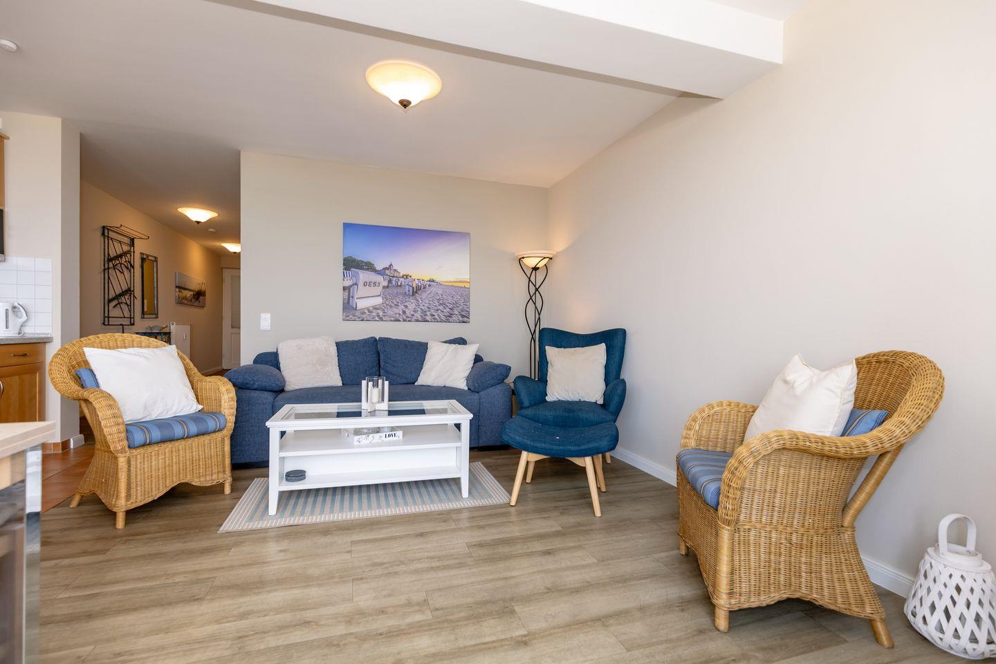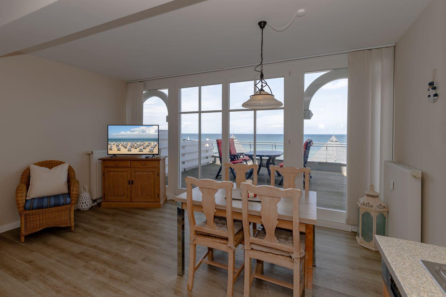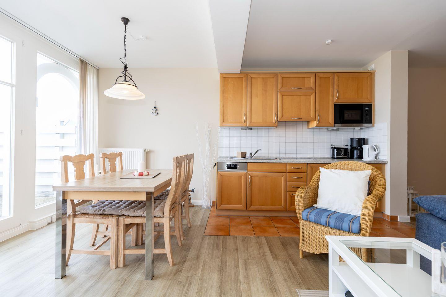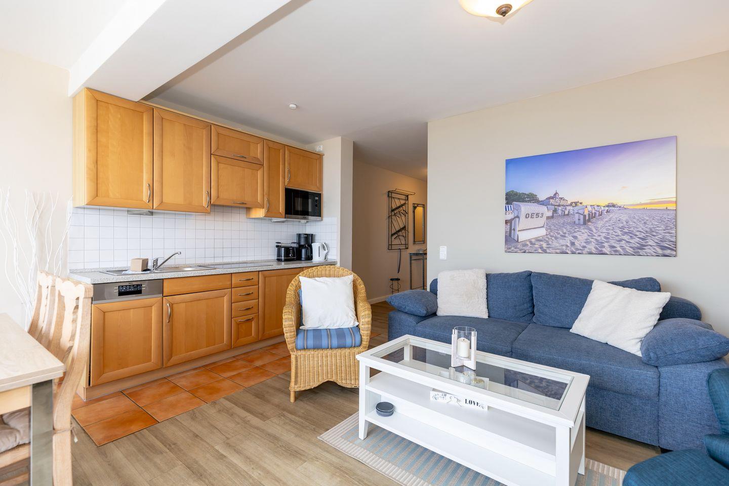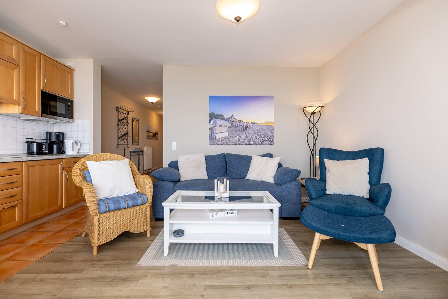 Das gemütliche Apartment verfügt über kostenfreies WLAN und eine voll ausgestattete offene Küche mit Geschirrspüler, Herd mit Ceranfeld, Mikrowelle, Wasserkocher, Kaffeemaschine, Toaster, Eierkocher und Tiefkühlfach. Der kombinierte Wohn- und Essbereich verfügt über eine TV-HiFi-Anlage mit Flachbild-TV, DVD-Player und eine Doppelschlafcouch. Sowohl der Esstisch, als auch der behagliche Sitzbereich bieten genügend Platz, um schöne Stunden beim Frühstück oder nach einem ereignisreichen Tag am Strand zu verbringen. Das separate Schlafzimmer ist ausgestattet mit einem großen Doppelbett (2 x 0,90 x 2,00). Das Schlafzimmerfenster liegt zum Atrium, dem begrünten, überdachten Innenhof des Gebäudes. Vom Balkon habt ihr einen direkten Blick auf die Ostsee. Der Balkon ist vom Wohn-/ Essbereich zugänglich.