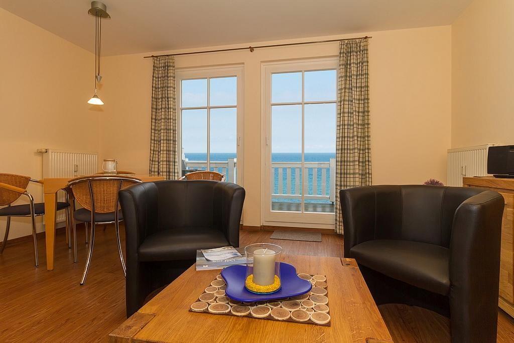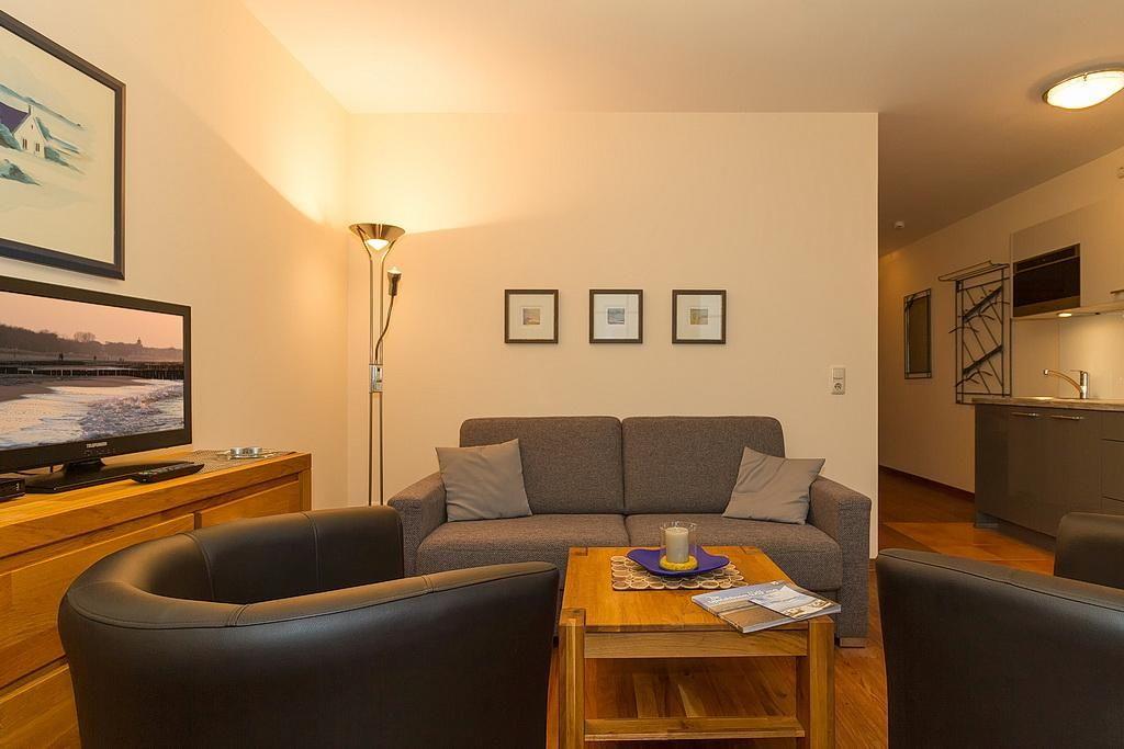Das gemütliche Nichtraucher-Apartment verfügt über kostenfreies WLAN und eine voll ausgestattete offene Küche mit Geschirrspüler, Mikrowelle, Wasserkocher, Kaffeemaschine, Toaster, Eierkocher und Gefrierfach. Der kombinierte Wohn- und Essbereich verfügt über eine TV-HiFi-Anlage mit Flachbild-TV, Blue-Ray Player und eine Doppelschlafcouch. Sowohl der Esstisch, als auch der behagliche Sitzbereich bieten genügend Platz, um schöne Stunden beim Frühstück oder nach einem ereignisreichen Tag am Strand zu verbringen. Das separate Schlafzimmer verfügt über ein großes Doppelbett (2 x 0,90 x 2,00). Das Schlafzimmerfenster liegt zum Atrium, dem begrünten, überdachten Innenhof des Gebäudes. Vom großen und möblierten Balkon aus habt ihr einen wunderschönen Blick auf die Ostsee direkt vor Ihrer Tür. Ein Kinderbett kann gegen Entgelt aufgestellt werden und auf Wunsch könnt ihr einen Hochstuhl hinzubuchen.