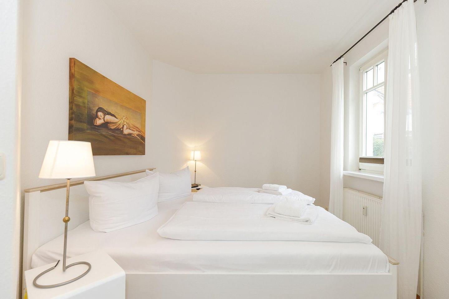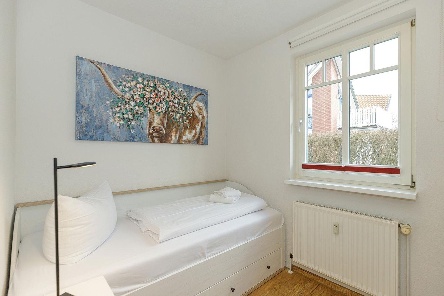 Das familienfreundliche Ferienapartment verfügt über ein Schlafzimmer mit Doppelbett und ein Schlafzimmer mit Einzelbett. Ein Kinderbett kann gegen Entgelt aufgestellt werden und auf Wunsch könnt ihr einen Hochstuhl hinzubuchen.