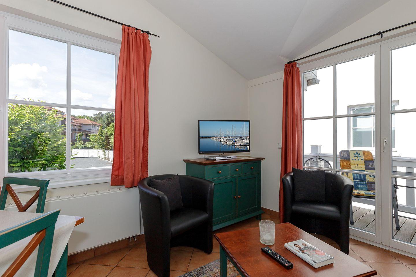 Das Apartment verfügt über kostenfreies WLAN und eine offene Küche, zwei separate Schlafzimmer mit Doppelbett bzw. zwei Einzelbetten, einen Wohnbereich mit Couchliege, TV und DVD-Player, ein Bad mit Dusche und einen kleinen Balkon mit Balkonmöbeln. Das Zimmer mit den zwei Einzelbetten ist optimal als Kinderzimmer geeignet und verfügt zudem über ein TV-Gerät. Ein Kinderbett kann gegen Entgelt aufgestellt werden und auf Wunsch könnt ihr einen Hochstuhl hinzubuchen.