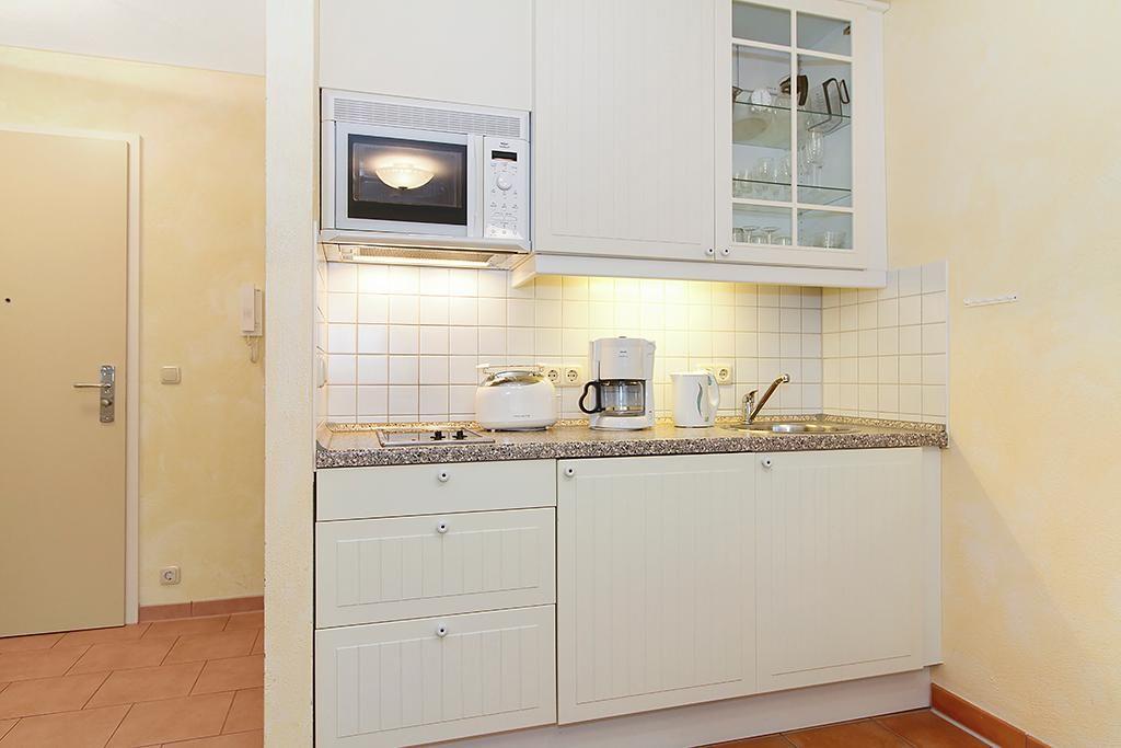 Eine voll ausgestattete offene Küche mit Mikrowelle und 2 Felder-Ceranherd ist ebenso im Apartment vorhanden wie auch eine TV-HiFi-Anlage und ein Blu-ray-Player.