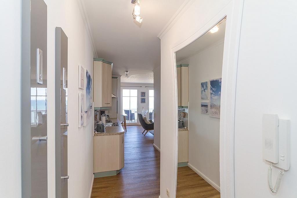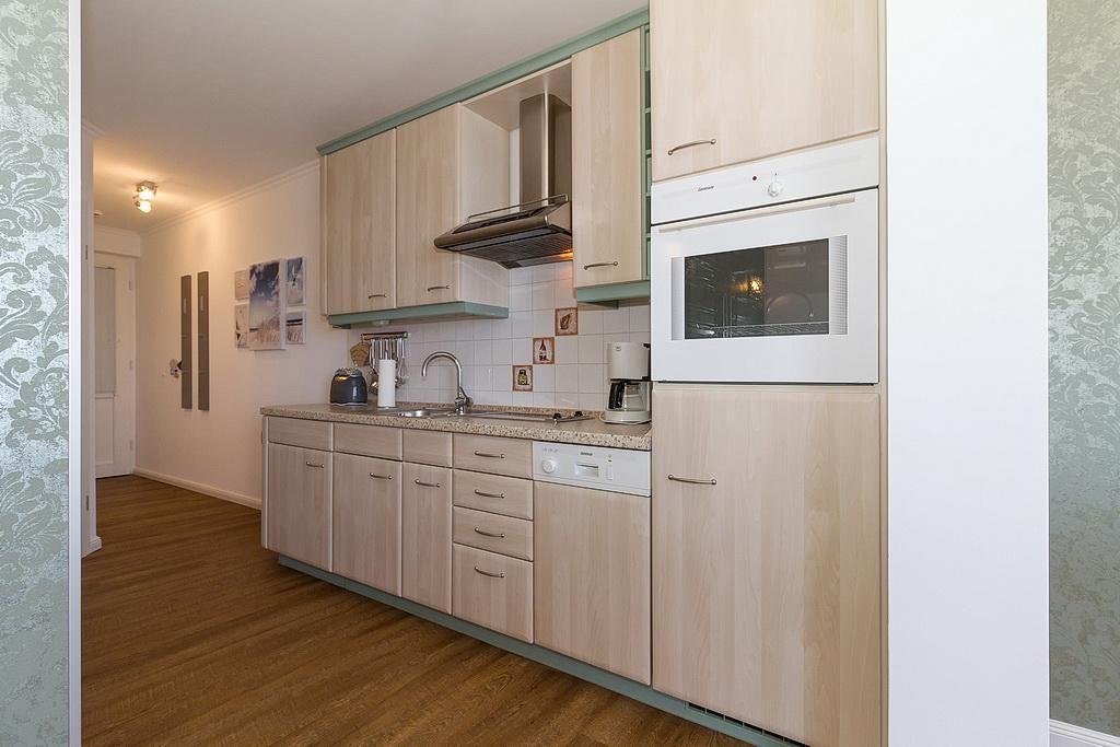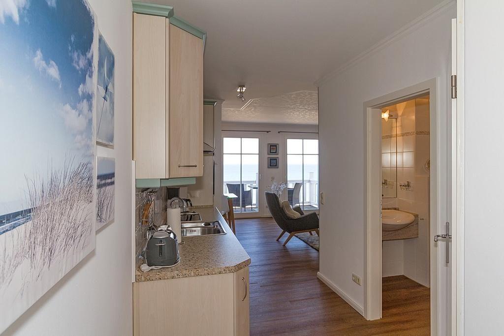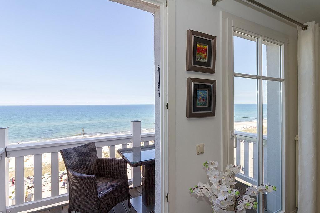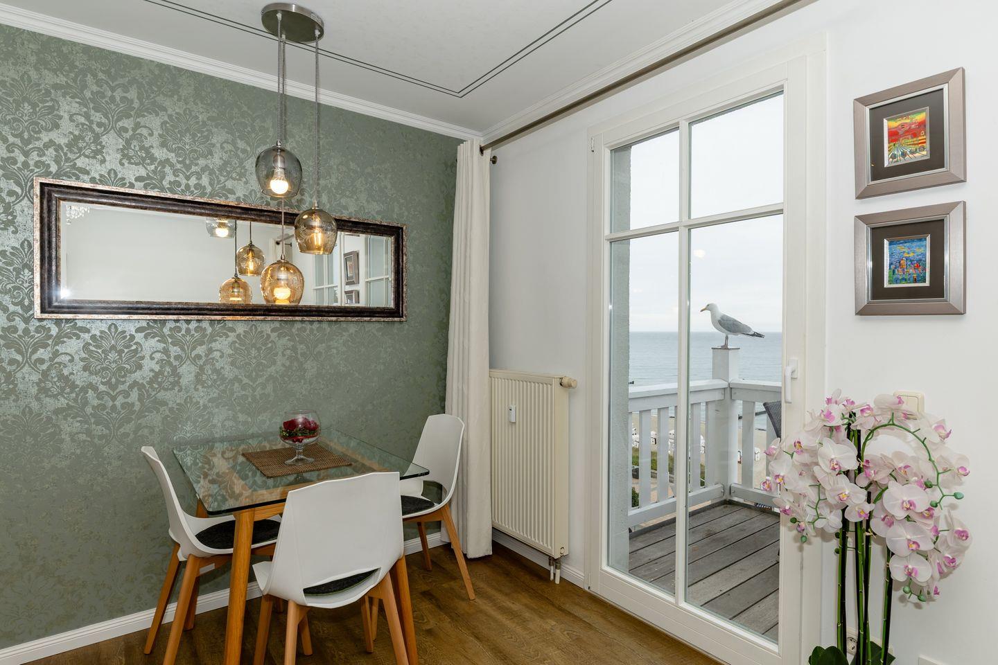 Das stilvolle Nichtraucher-Apartment verfügt über kostenfreies WLAN und eine voll ausgestattete offene Küche mit Geschirrspüler, Backofen, Wasserkocher, Kaffeemaschine, Toaster und Tiefkühlfach. Der kombinierte Wohn- und Essbereich verfügt über eine TV-HiFi-Anlage mit Flachbild-TV und DVD-Player. Vom Balkon aus habt ihr einen uneingeschränkten Blick auf die Ostsee und den feinsandigen Strand. Sowohl der Esstisch, als auch der behagliche Sitzbereich laden dazu ein gesellige und entspannte Stunden beim Frühstück oder nach einem ereignisreichen Tag am Strand zu verbringen. Das separate Schlafzimmer verfügt über ein großes Boxspringbett (1,80 x 2,00) mit Federbettware. Das Schlafzimmerfenster liegt zum Atrium, dem begrünten, überdachten Innenhof des Gebäudes. Ein Kinderbett kann gegen Entgelt aufgestellt werden und auf Wunsch könnt ihr einen Hochstuhl hinzubuchen. Überdies gehören ein Bügeleisen, ein Bügelbrett und ein Föhn zur Ausstattung der Wohnung.