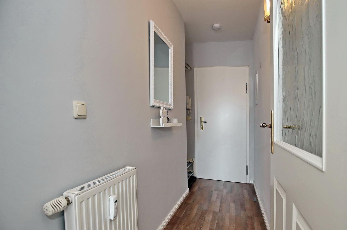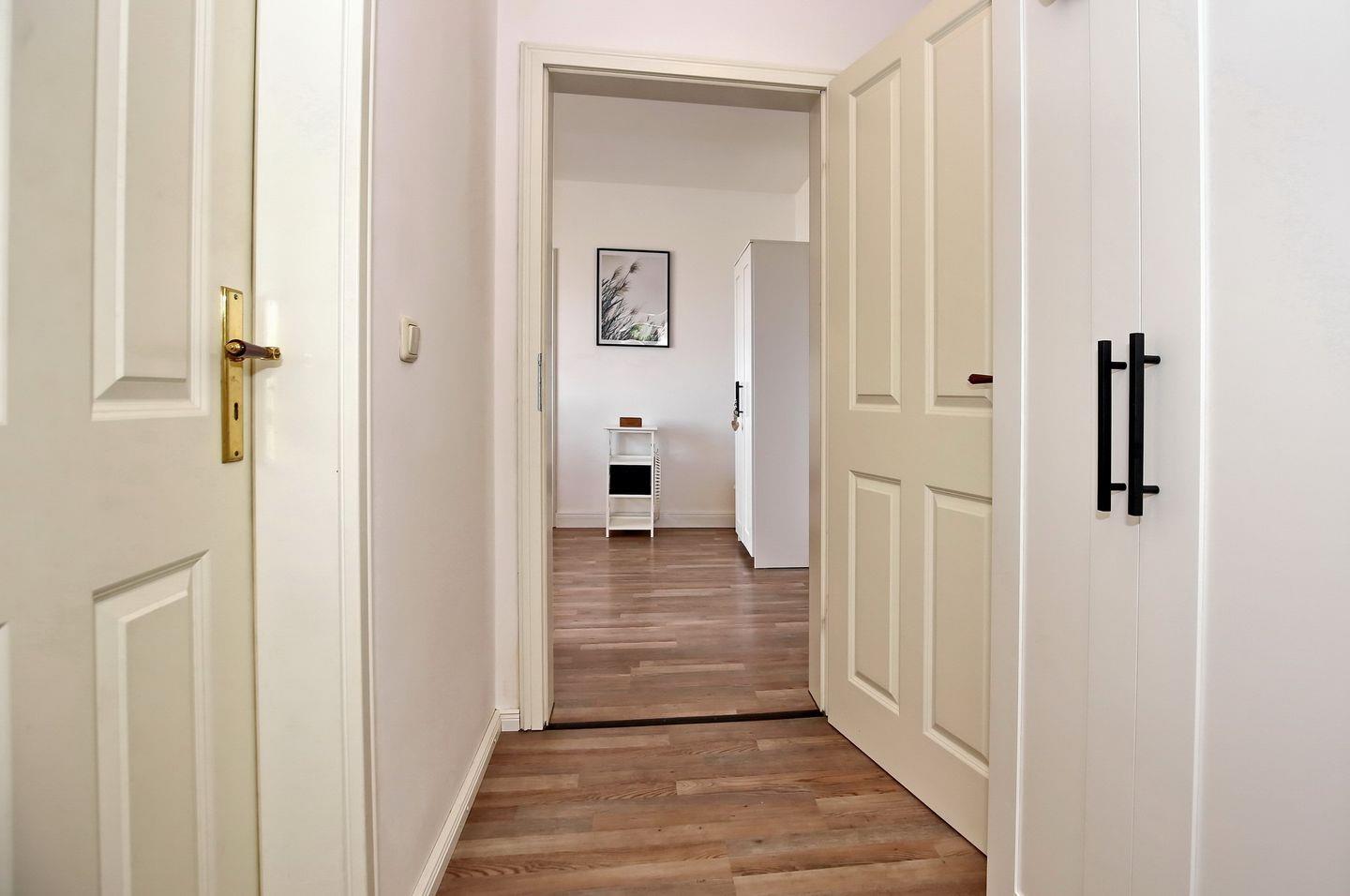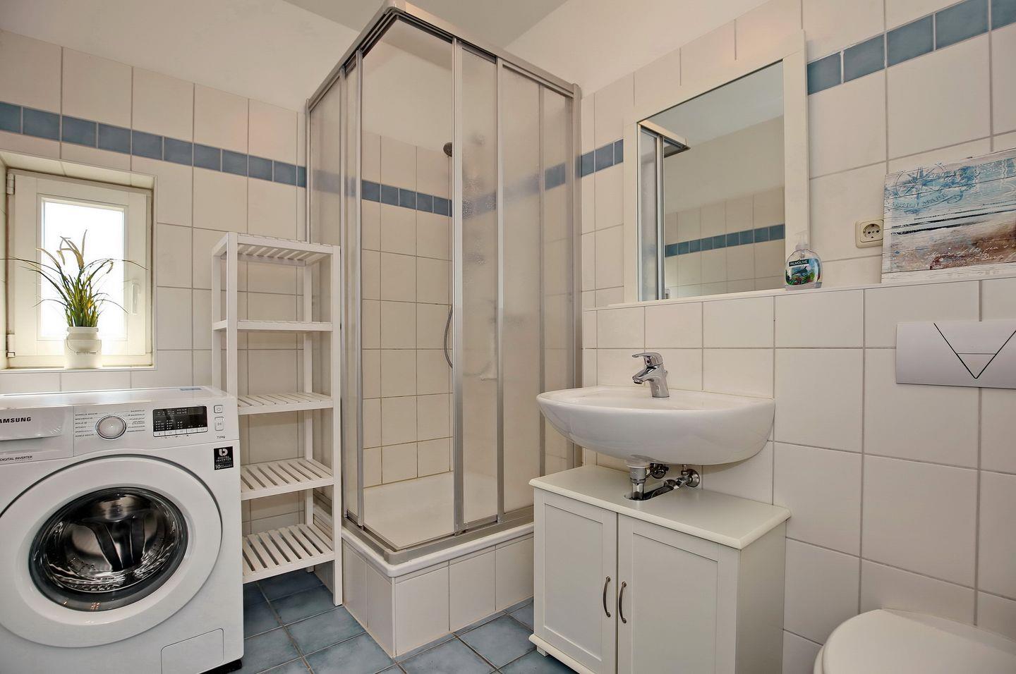 Im Badezimmer findest du neben Dusche und WC auch eine Waschmaschine sowie Fußbodenheizung, die für wohlige Wärme sorgt. Als Bodenbelag findest du in der ganzen Wohnung Laminat vor.