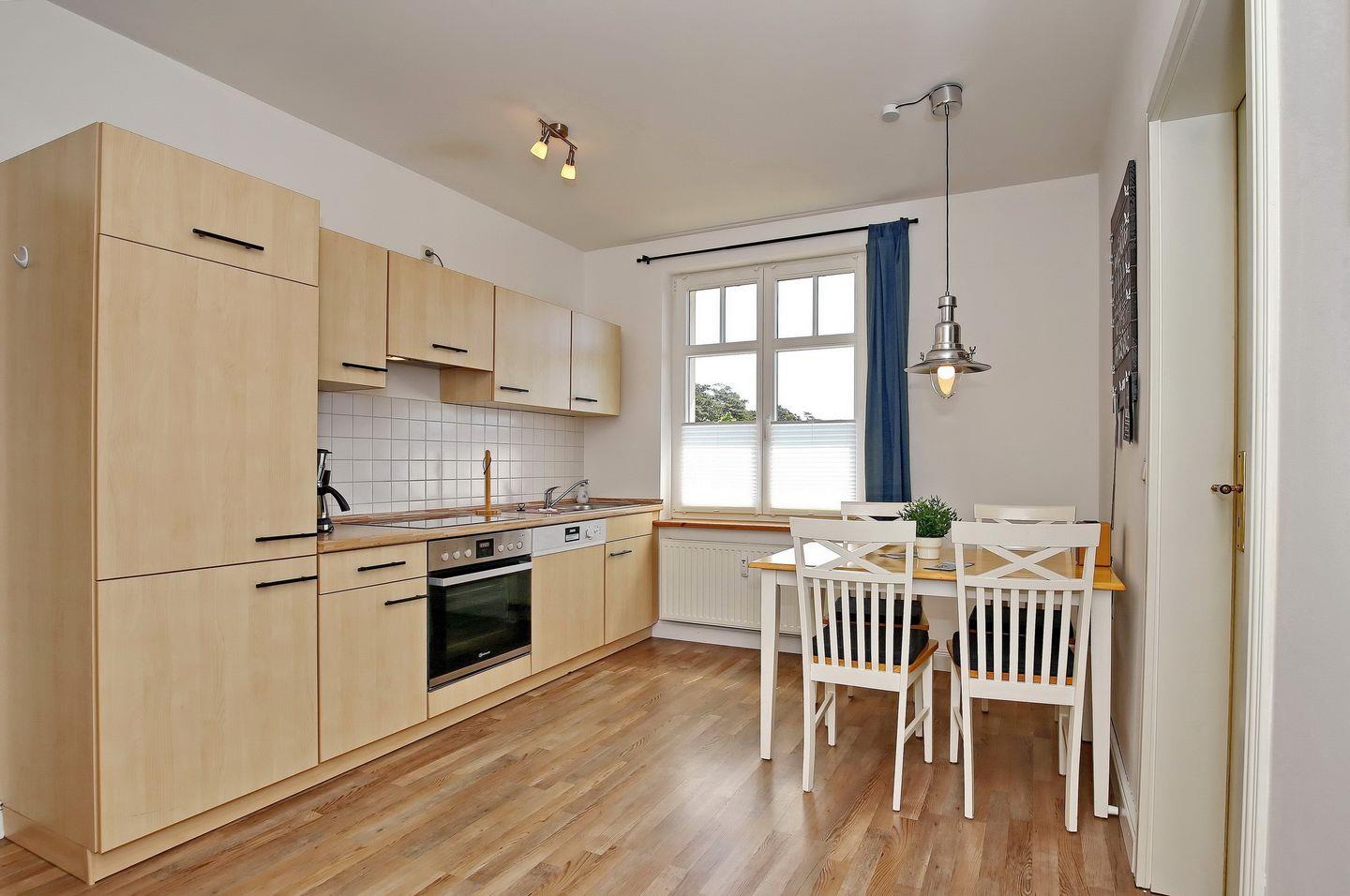 Die separate Küche verfügt über einen Herd (4-Ceran-Kochfelder), Backofen, Kühlschrank mit Gefrierfach, Geschirrspüler, Mikrowelle, Kaffeemaschine, Wasserkocher, Toaster und ein Radio. Ein Kinderhochstuhl steht für die kleinen Gäste ebenfalls zur Verfügung.