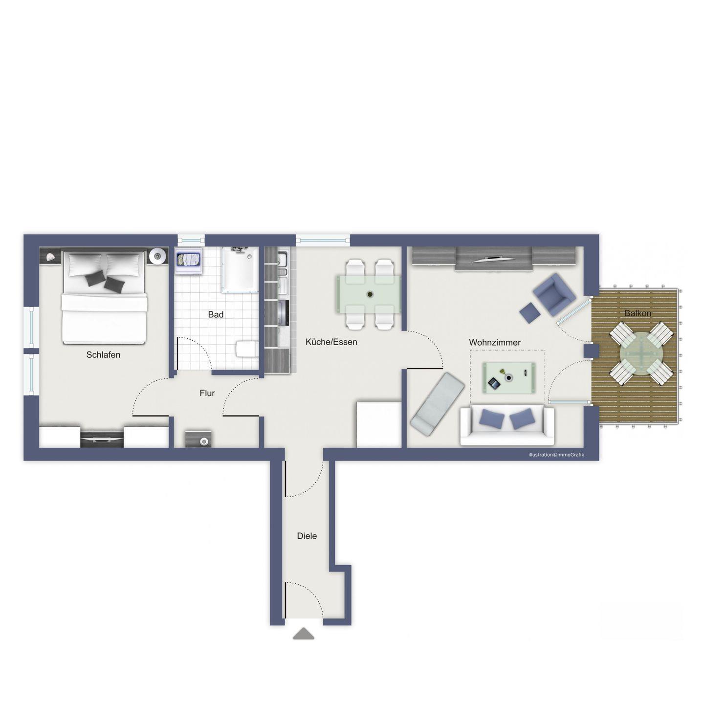 Es erwarten dich ein einladender Wohnbereich mit Schlafsofa (140 x 200 cm), eine separate Küche mit Esstisch, ein Schlafzimmer sowie ein Badezimmer. Auf dem Balkon zur Südseite kannst du die Sonne genießen.