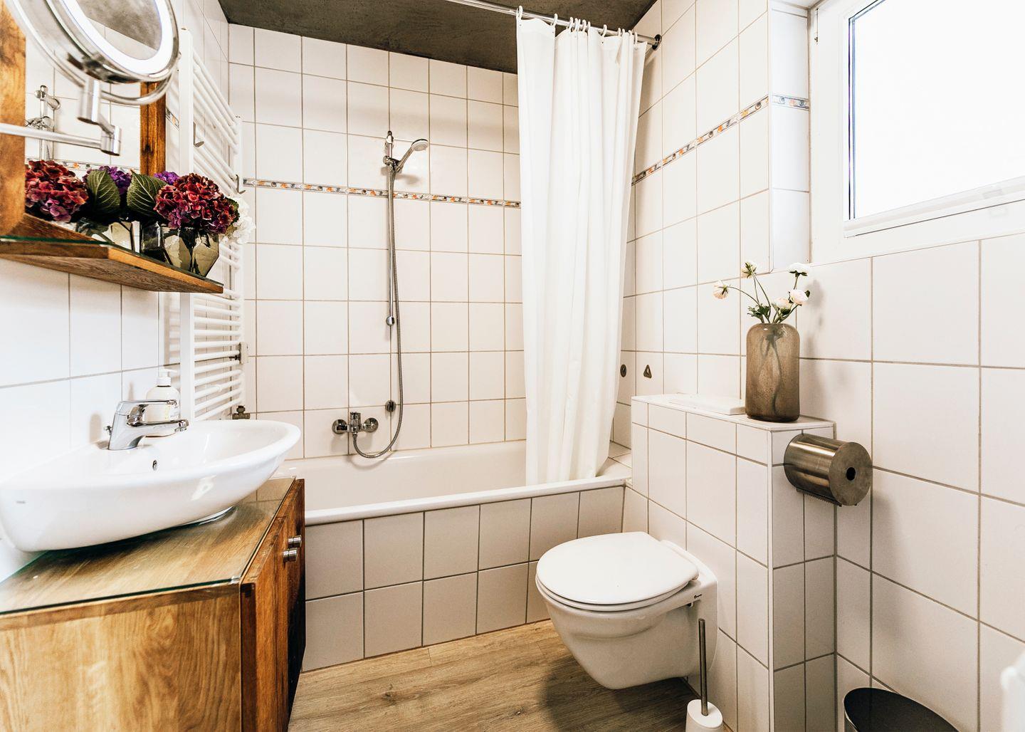 Die Ferienwohnung verfügt über ein Wannenbad mit WC, eine Waschmaschine sowie einen Föhn.