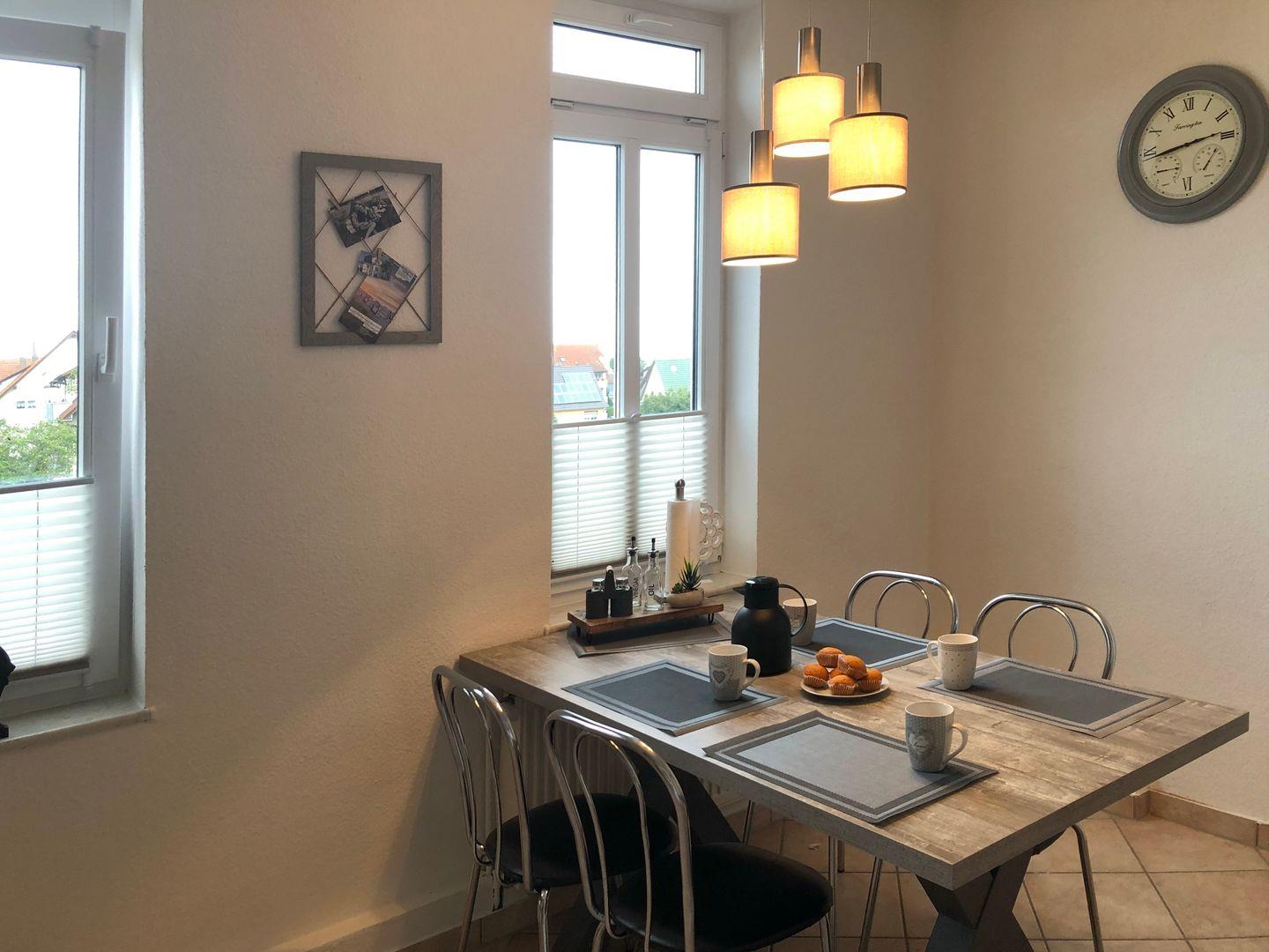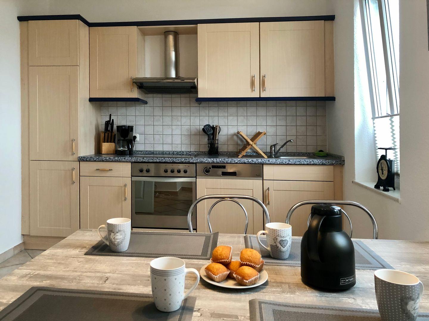 Der Küchenbereich der Ferienwohnung ist für dich mit einem Geschirrspüler, einem Kühlschrank mit Gefrierfach, einem Herd mit Backofen und einem 4-Platten-Cerankochfeld ausgestattet. Ein Wasserkocher, eine Kaffeemaschine und ein Toaster vervollständigen die Kücheneinrichtung.