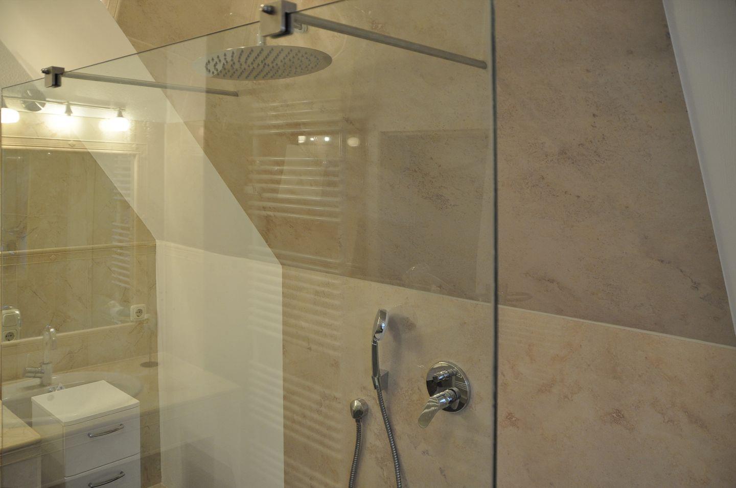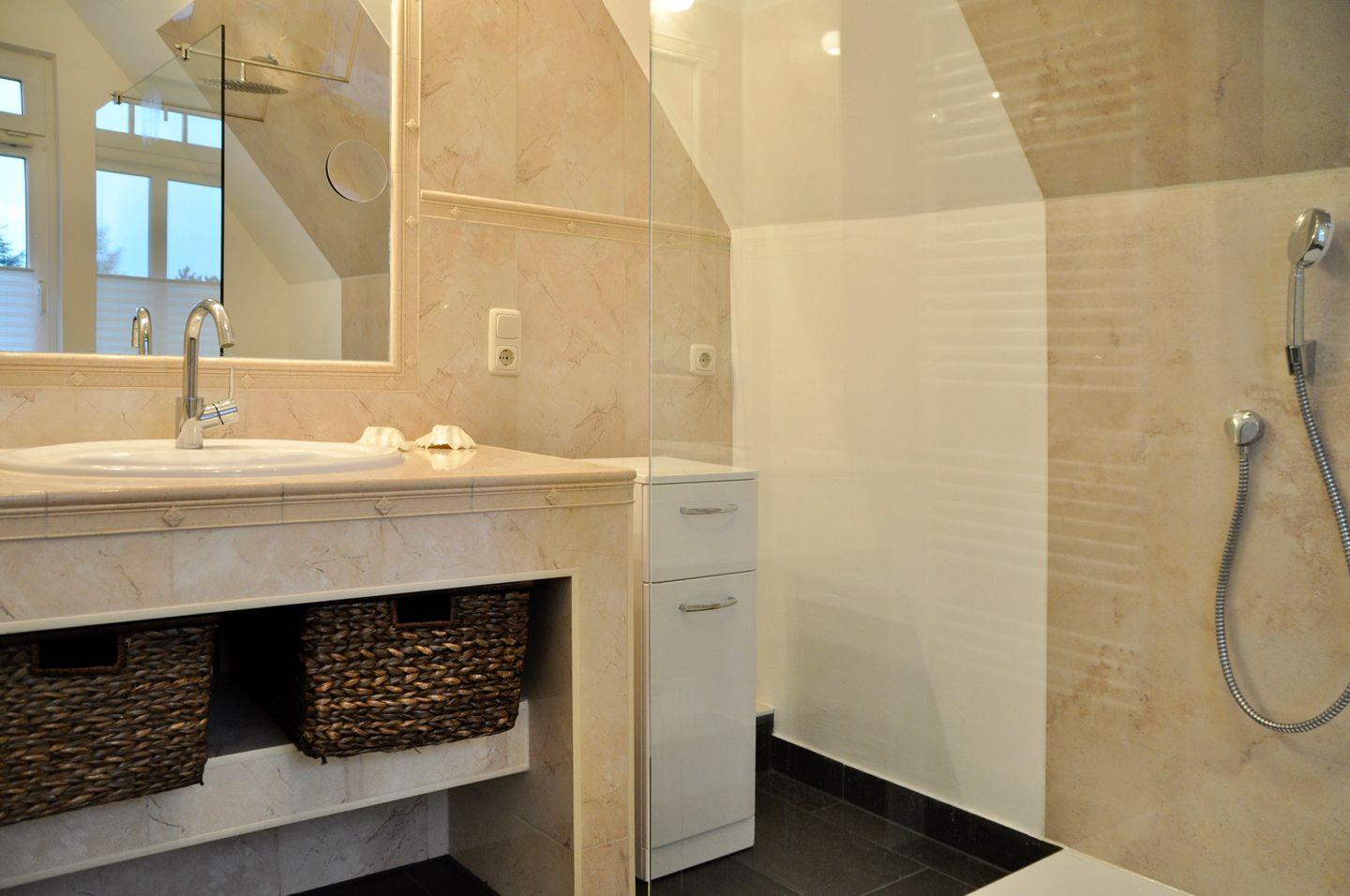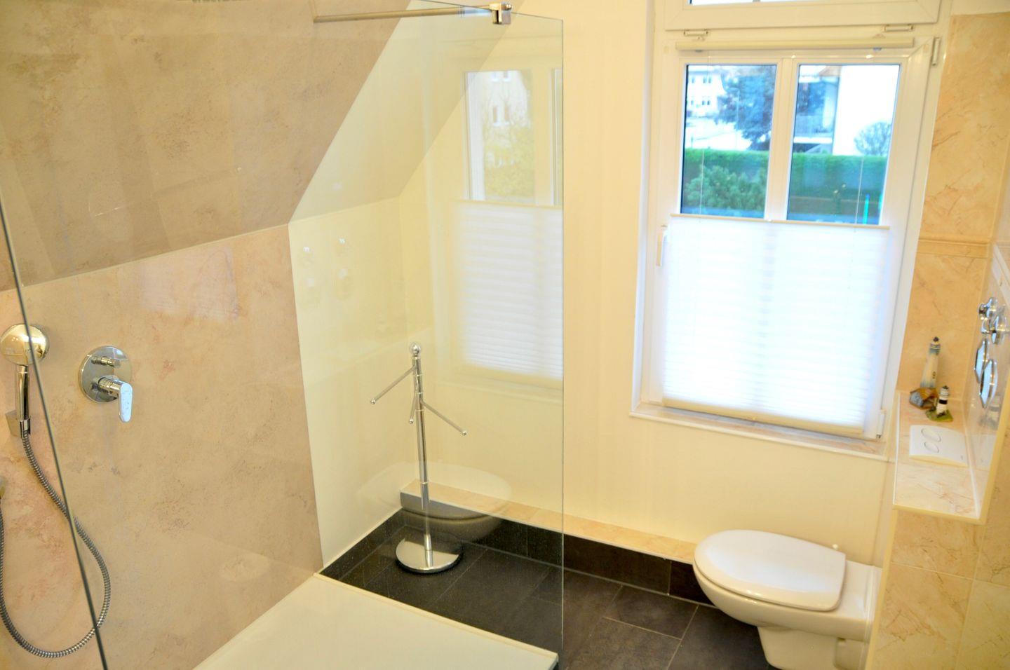 Das geräumige Tageslichtbad der Ferienwohnung ist für dich mit einer bodengleichen Dusche und einem WC ausgestattet. Für deine Waschutensilien ist ein kleiner Schrank vorhanden. Das Bad ist gefliest und verfügt über eine Handtuchheizung. Die Wohn- und Schlafbereiche sind mit Laminat ausgestattet. In dieser Nichtraucher-Wohnung sind Haustiere erlaubt.