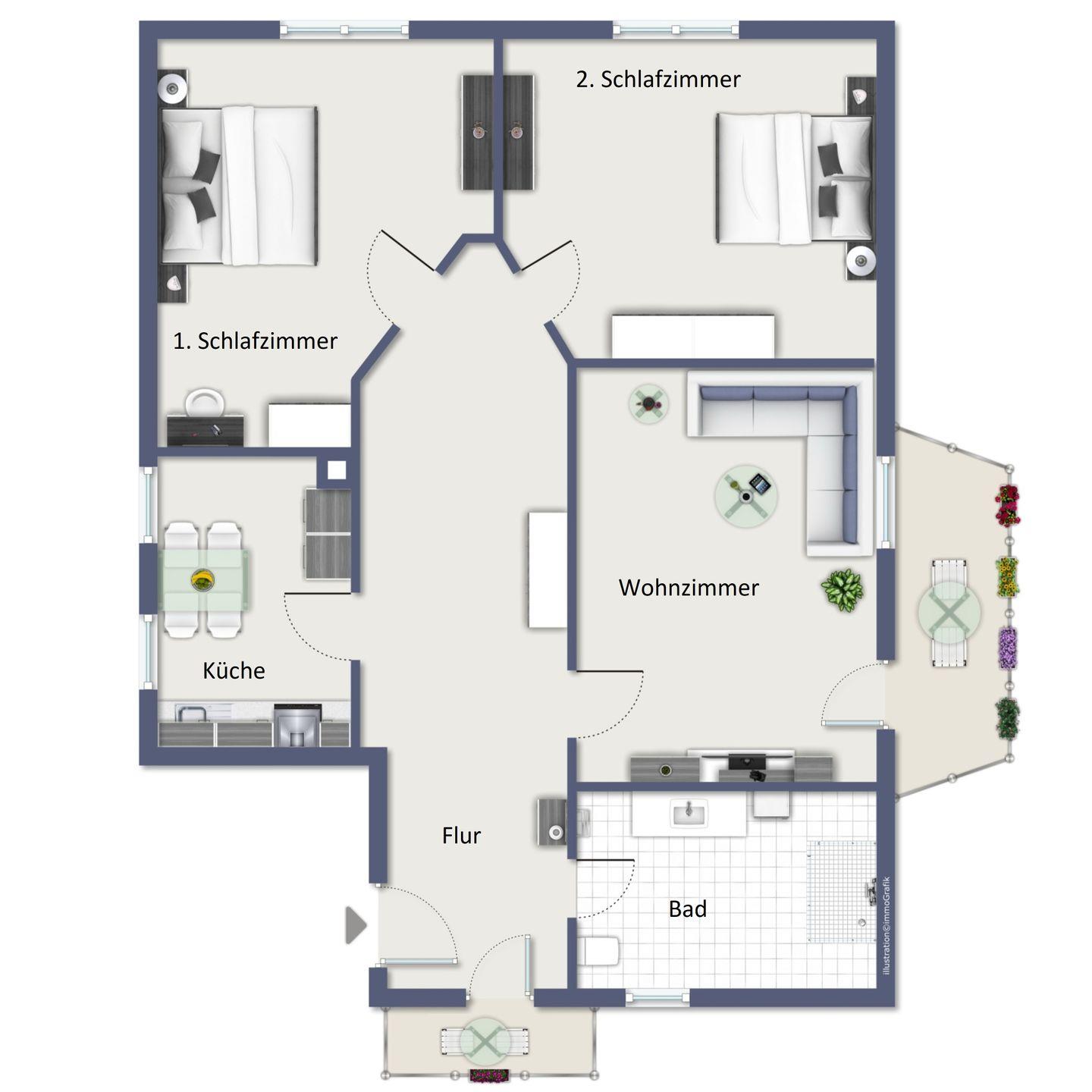 Die 3-Zimmer-Ferienwohnung in der Doberaner Straße in Kühlungsborn Ost bietet auf 72 m² bis zu 4 Personen Platz für erholsame Urlaubstage. Genießen Sie die Sonne und die Ostseeluft auf dem Balkon der Wohnung.