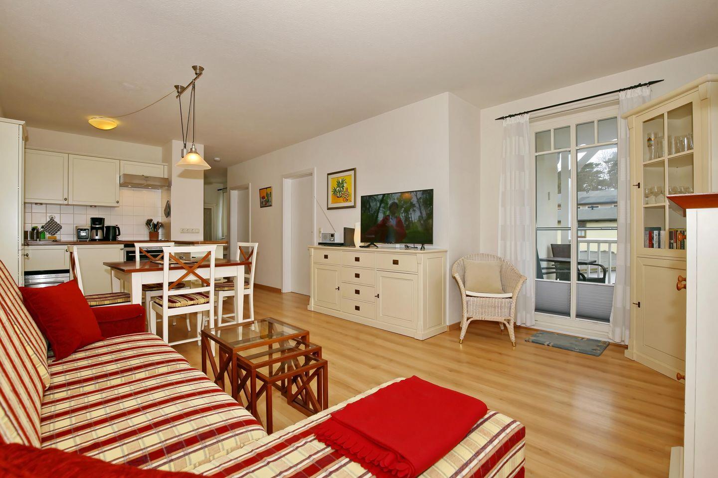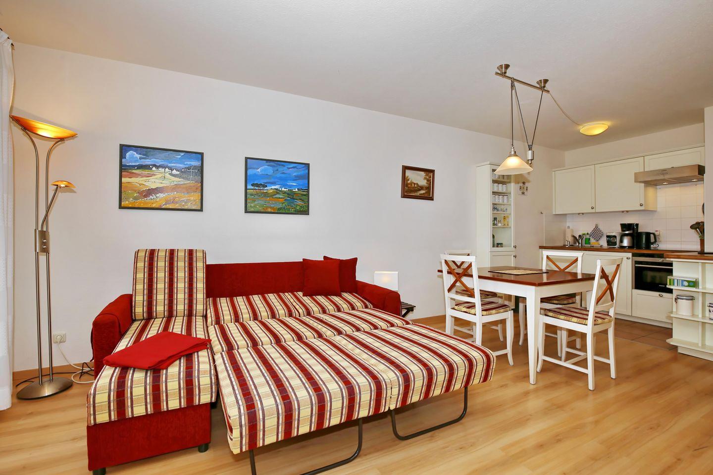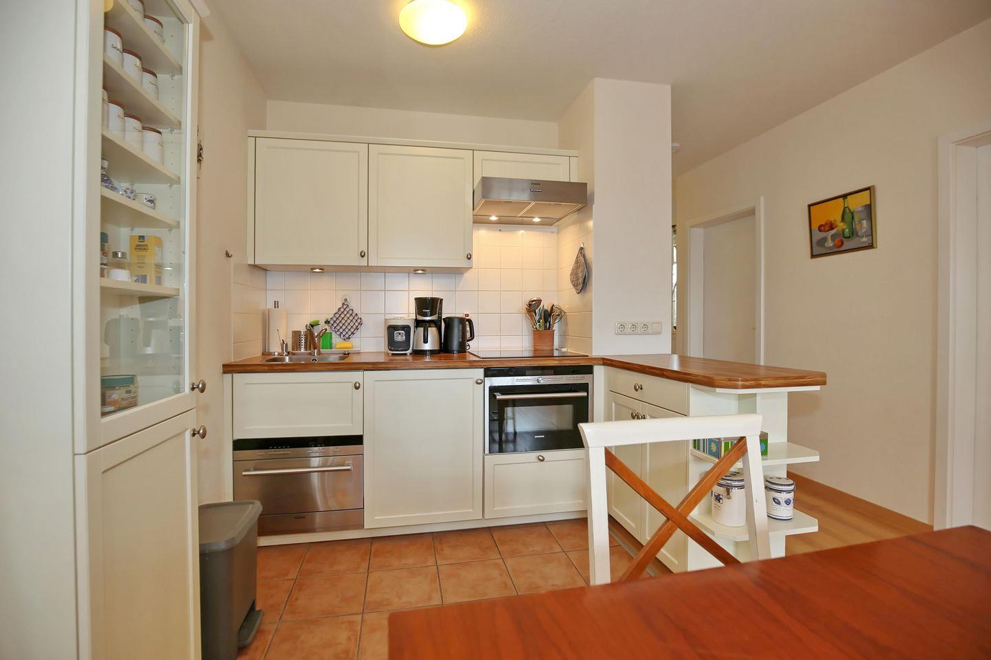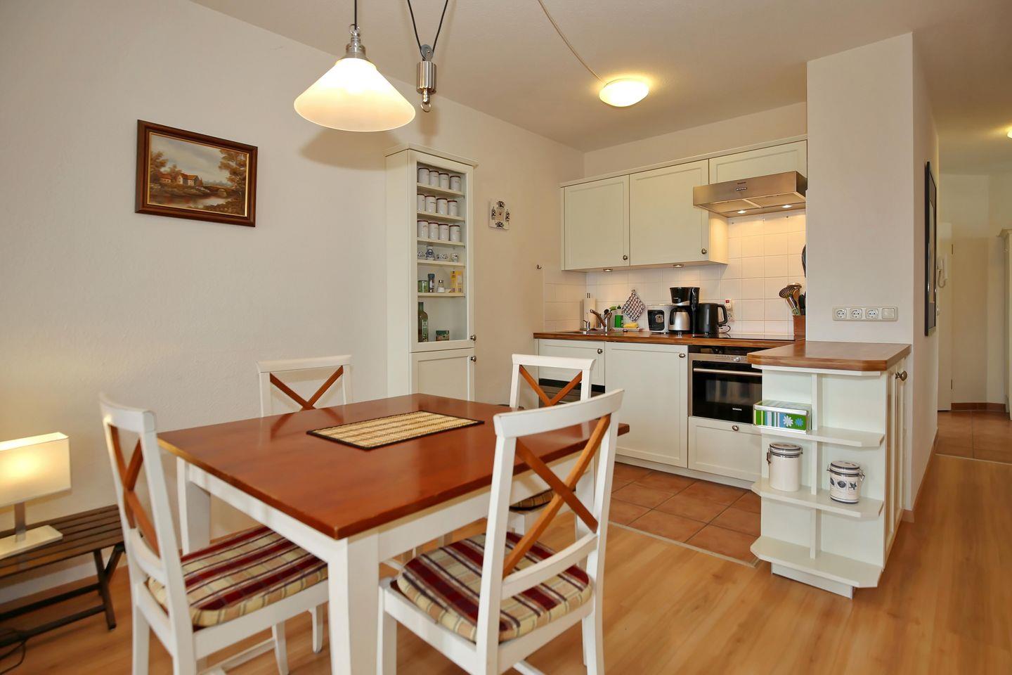 Ebenfalls im Raum integriert ist die Küchenzeile. Diese bietet dir ein Induktionskochfeld (4 Platten-Kochfeld), einen Backofen mit integrierter Mikrowelle, einen kleinen Geschirrspüler sowie einen Kühlschrank mit Gefrierfach. Selbstverständlich findest du hier auch eine Kaffeemaschine, einen Wasserkocher und einen Toaster vor. Des Weiteren steht dir in der Küche noch eine Cafissimo-Kaffeemaschine mit Espressofunktion zur Verfügung. Im angrenzenden Essbereich kannst du deine gemeinsamen Mahlzeiten genießen.