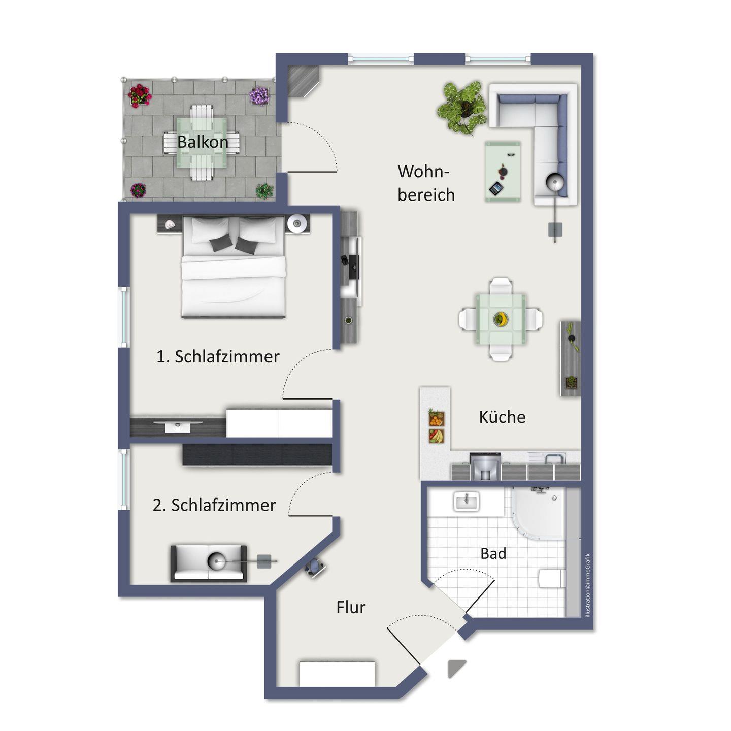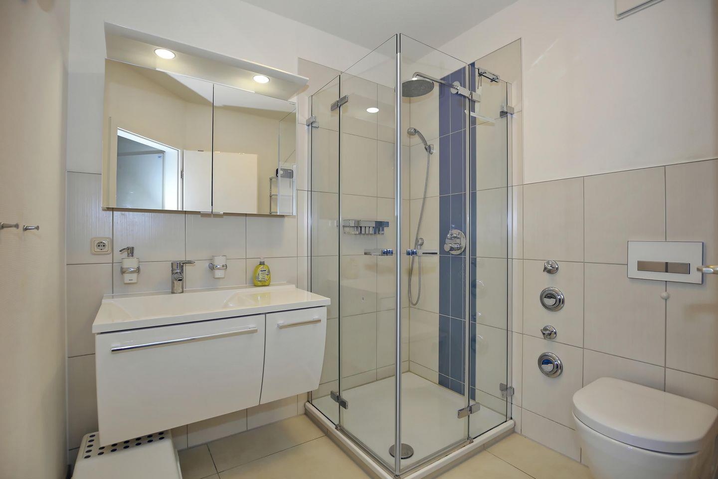In der Wohnung befindet sich außerdem ein geräumiges Duschbad. In der Wohnung wurde als Bodenbelag Laminat gewählt. In Bad, Flur und vor der Küchenzeile sind Fliesen verlegt.