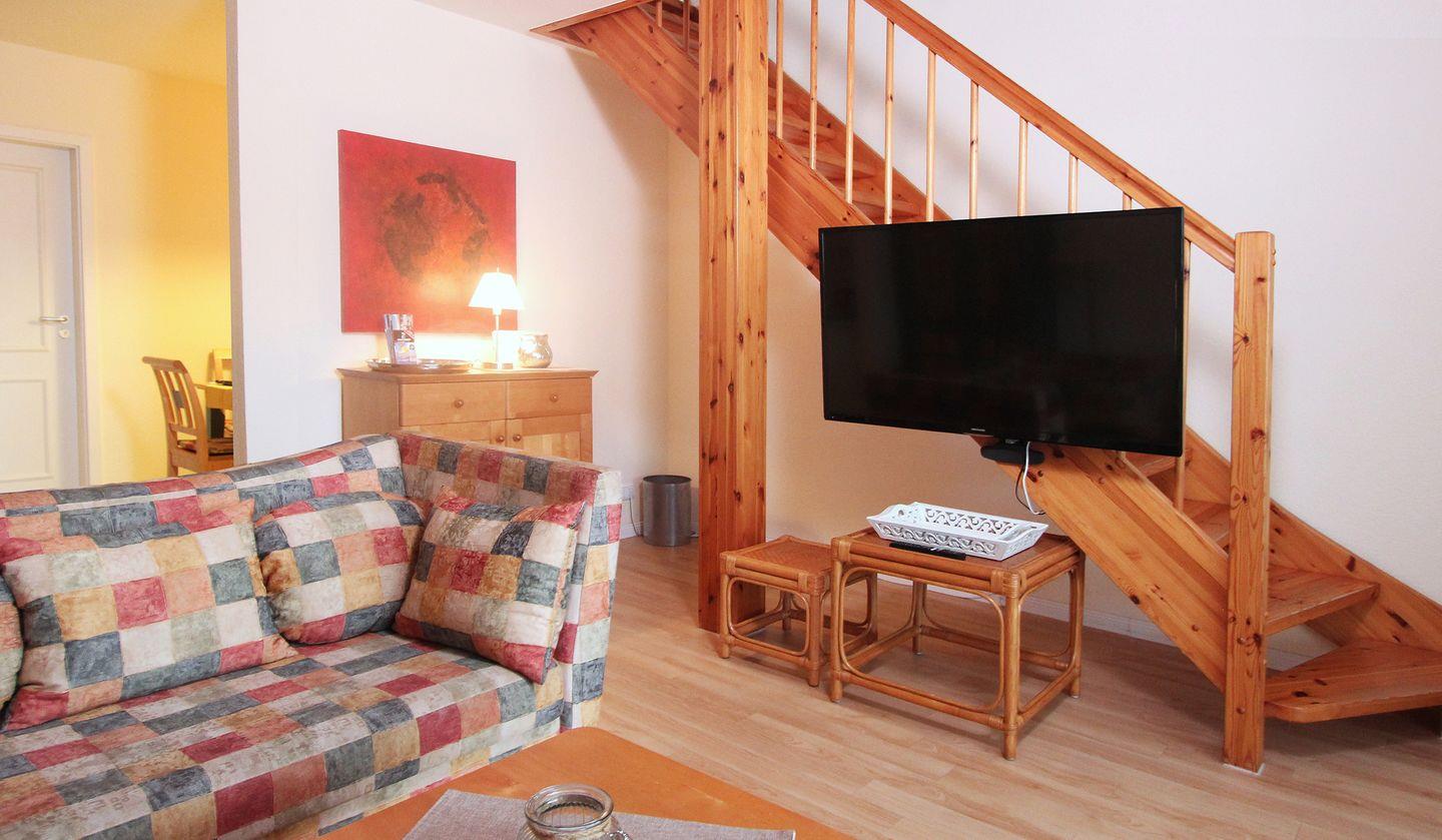 Das helle Wohnzimmer ist mit einer gemütlichen Sofaecke, einem Flachbild-TV und einem Essbereich ausgestattet. Von hier aus haben Sie direkten Zugang zum Balkon, auf dem Sie wunderbar entspannen können.