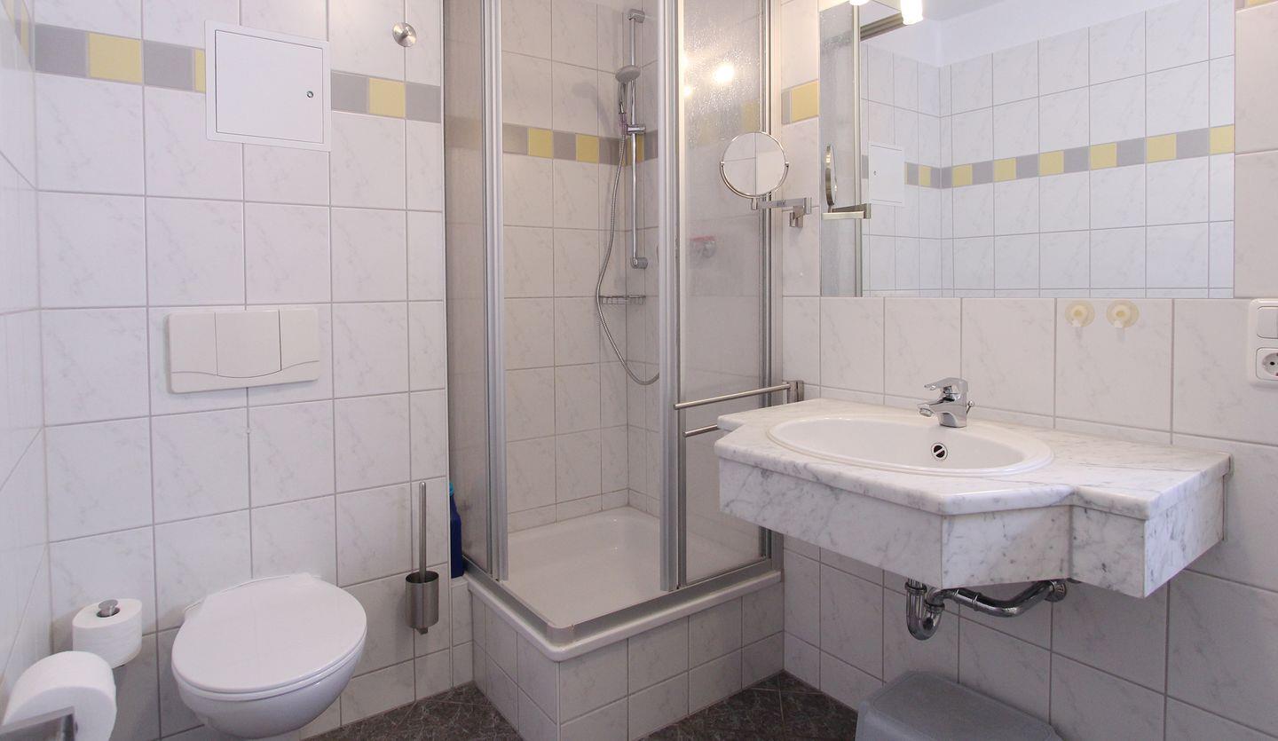Das Badezimmer bietet eine große Dusche, ein Waschbecken und ein WC.