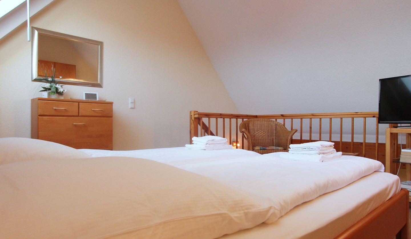 Das offene Schlafgalerie ist mit einem großen Doppelbett und einem geräumigen Kleiderschrank ausgestattet, sodass Sie genügend Stauraum haben.