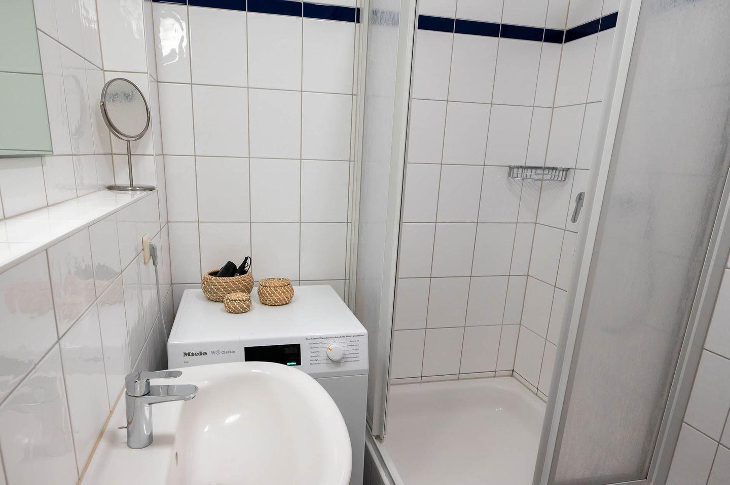 Sie verfügt über ein geräumiges Wohn-/ Esszimmer mit Balkon und großer Küchenzeile, einem Schlafzimmer und einem Bad mit Dusche und Waschmaschine.