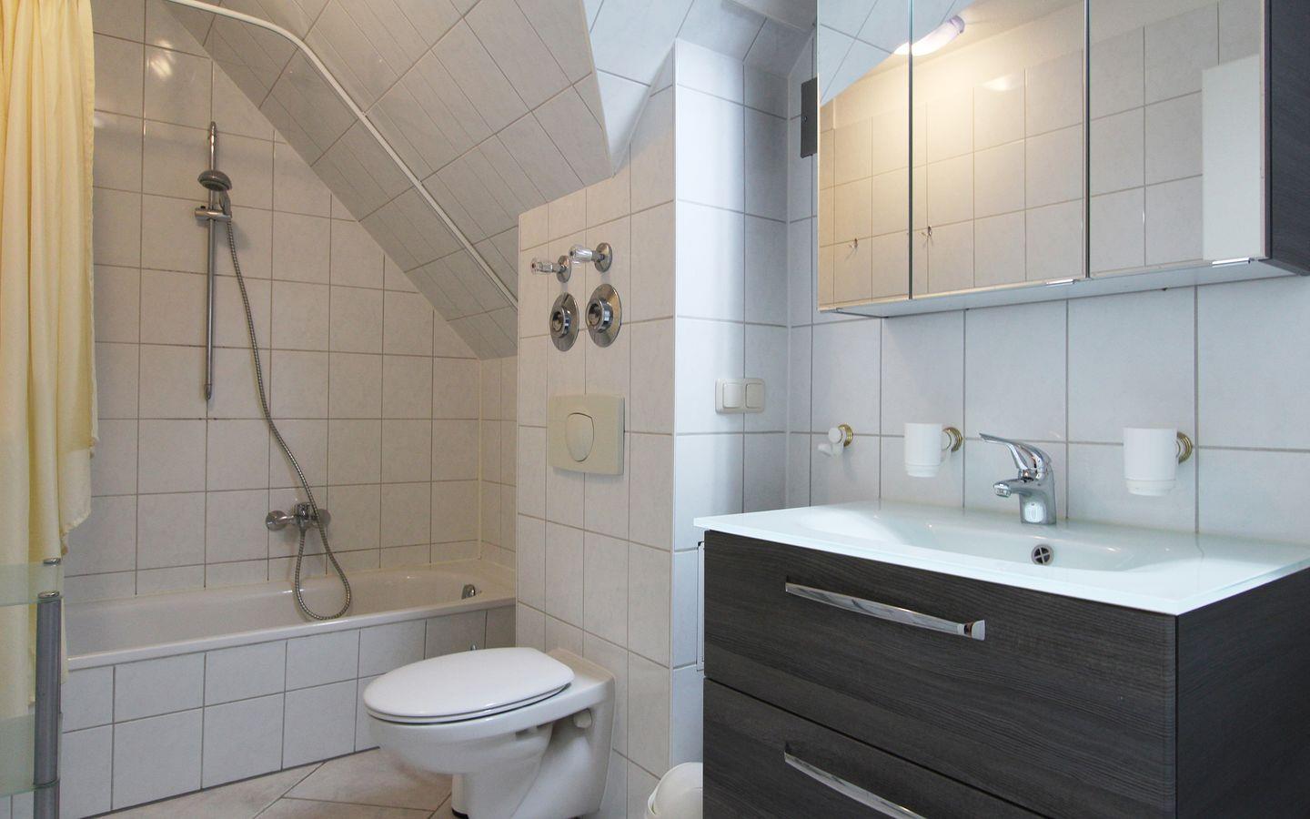Das Vollbad mit Badewanne bietet eine Dusche sowie auch WC.