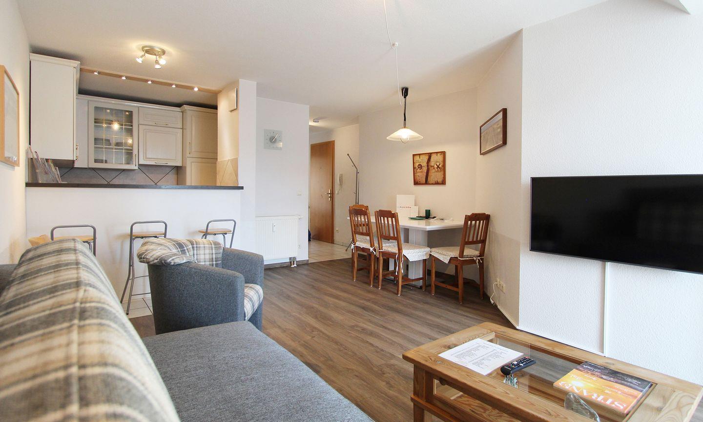 Die Ferienwohnung "Birgit" bietet auf 45m² Platz für bis zu 3 Personen. Das Wohnzimmer ist geräumig mit Schlafsofa, Smart-TV und Essbereich. Ebenfalls ist hier der Zugang zum französischem Balkon mit Ostausrichtung.