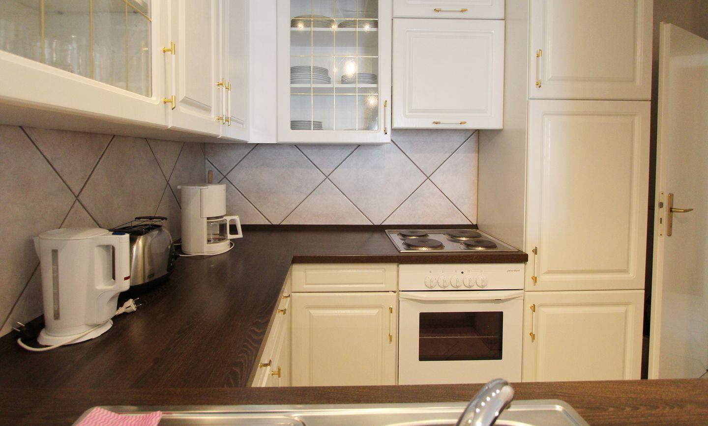 Die offene Küche ist vollausgestattet mit Kühlschrank + Gefrierfach, Geschirrspülmaschine sowie E-Herd. Wasserkocher, Toaster und Kaffeemaschine findet man ebenfalls vor.