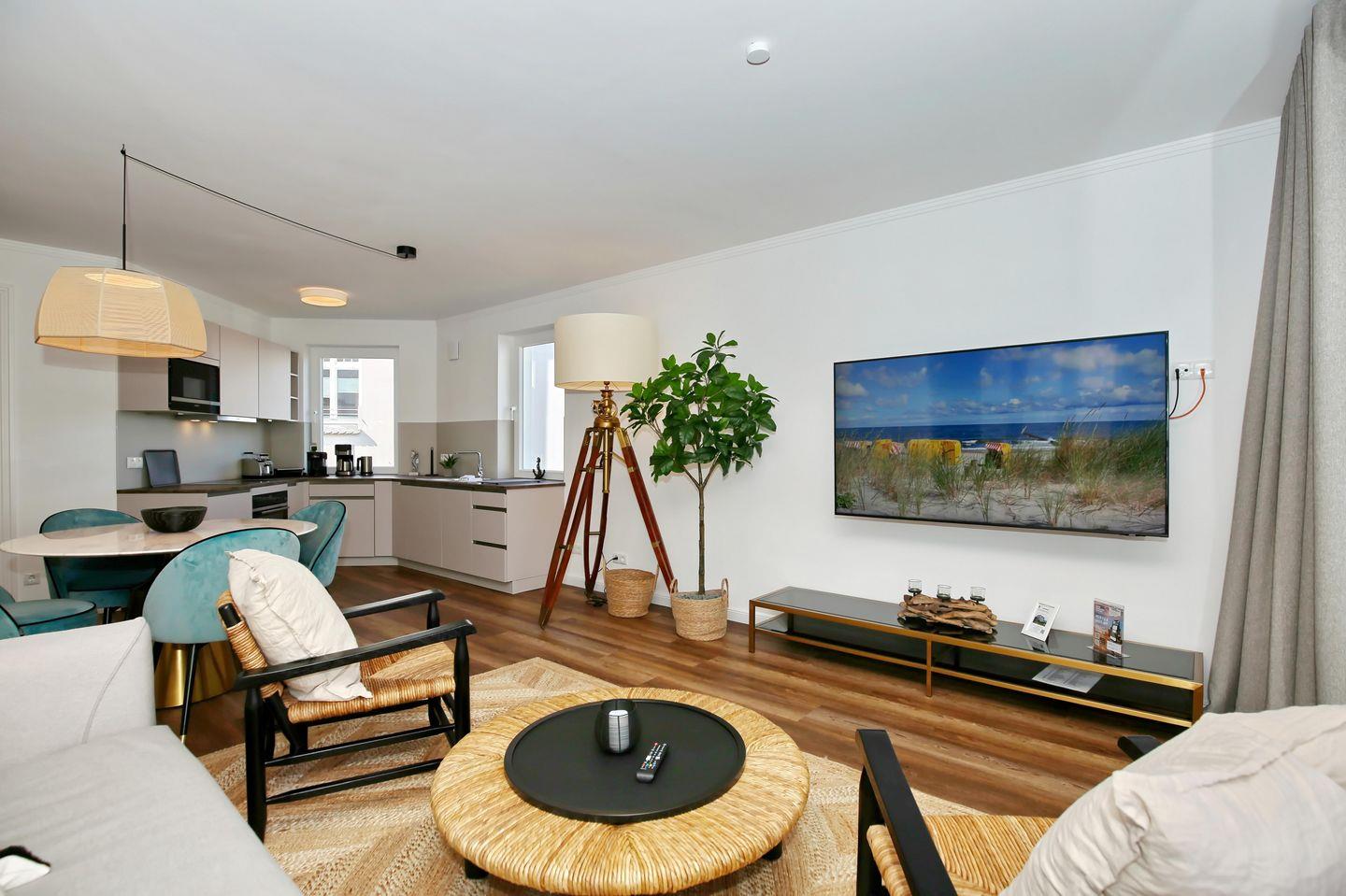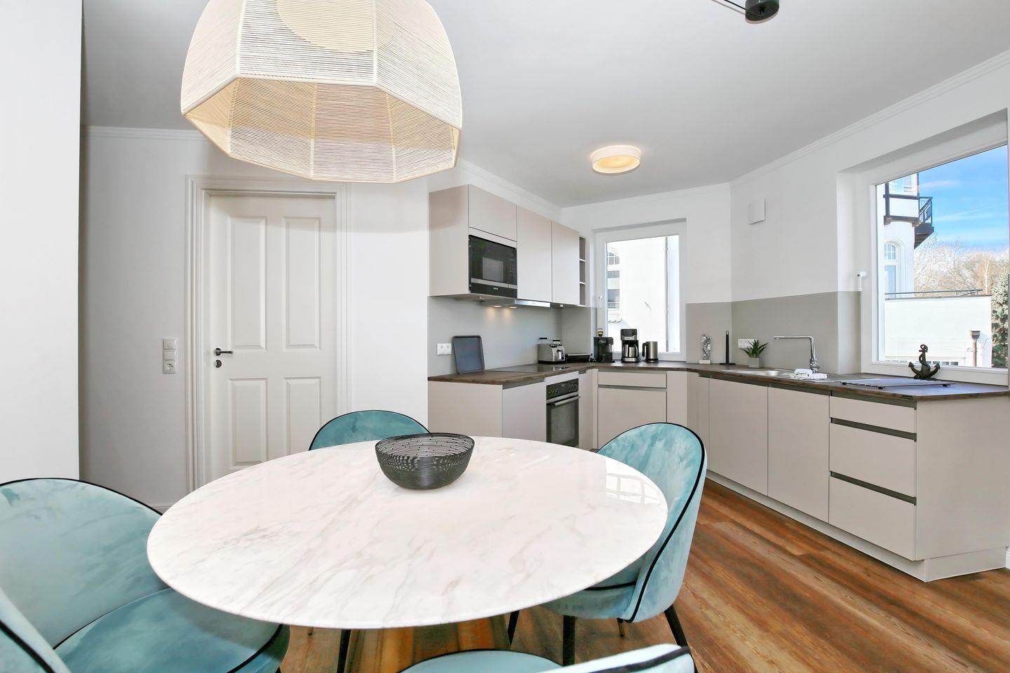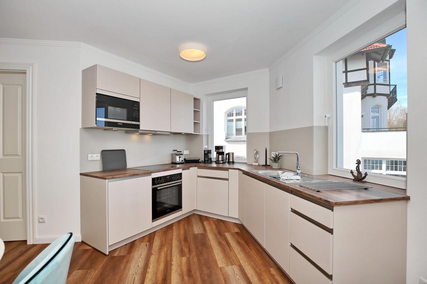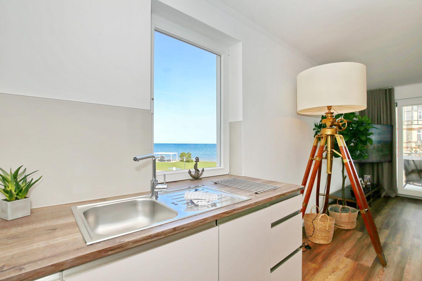 Die angrenzende offene Küchenzeile ist mit einem Kühlschrank mit Gefrierfach, einem Geschirrspüler, einem 4-Platten-Cerankochfeld, einer Mikrowelle und einem Backofen voll ausgestattet. Die Küchenausstattung wird komplettiert durch einen Toaster, eine Kaffeemaschine, eine Espressomaschine (Nespresso) und einen Wasserkocher. Von hier aus hast du ebenfalls einen Blick auf die Ostsee.