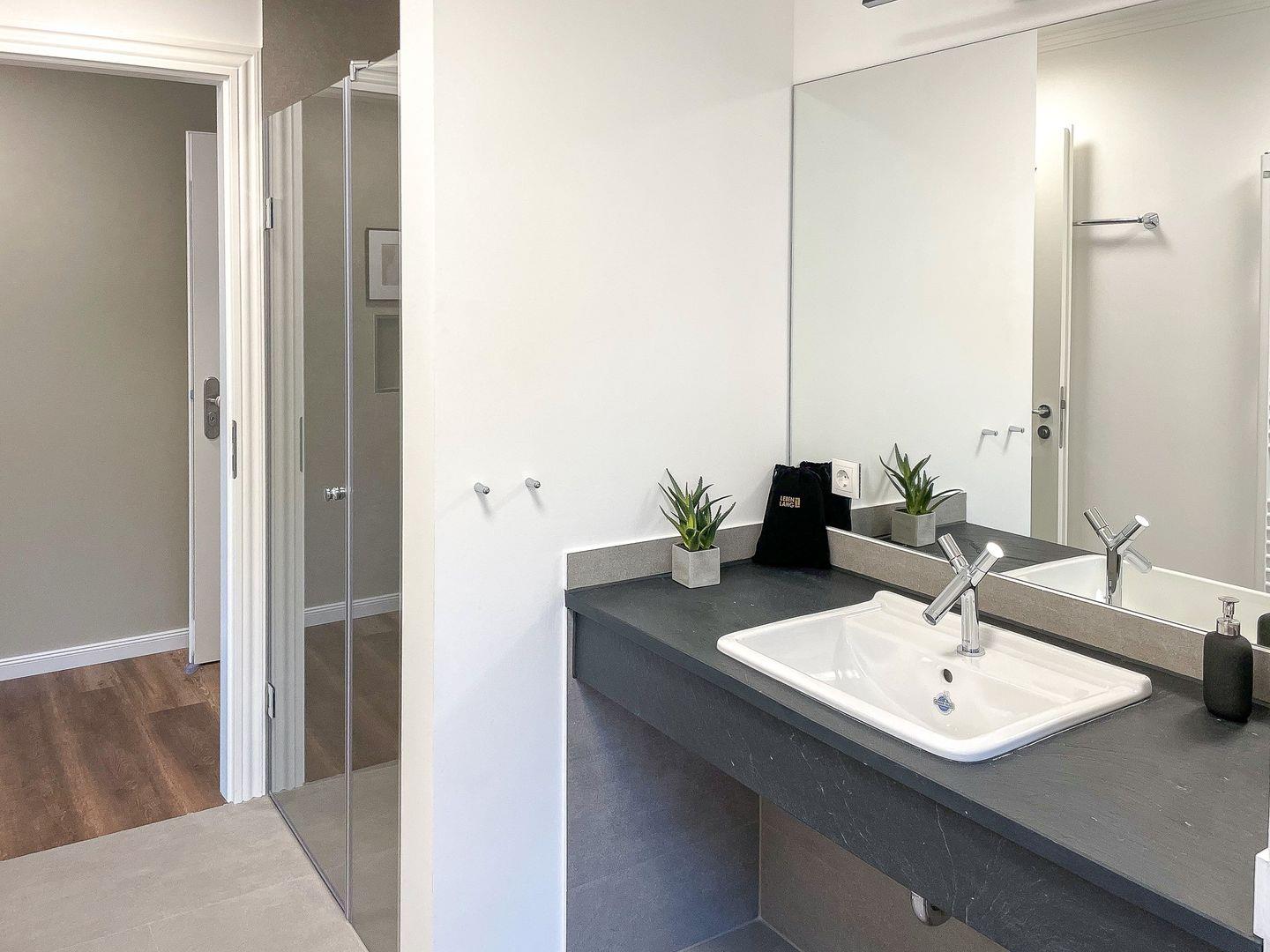 Das Tageslichtbad mit ebenerdiger Dusche ist mit einem großzügigen Waschtisch und einem Föhn ausgestattet.