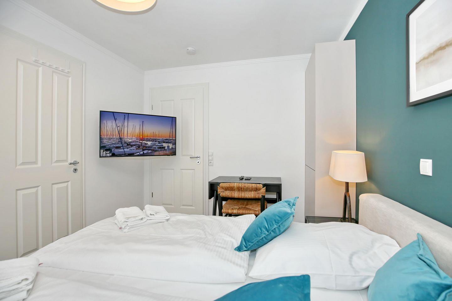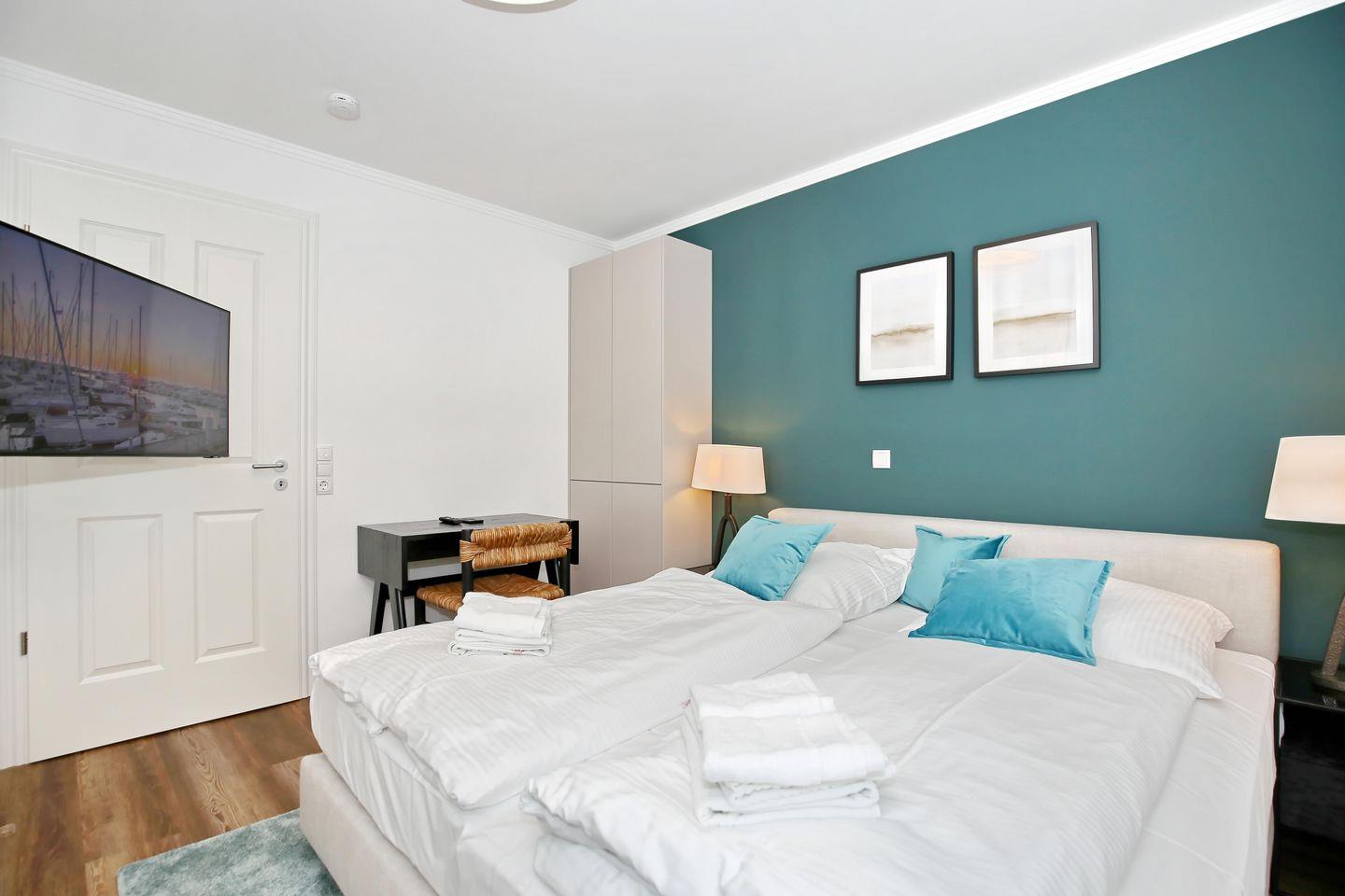 Das Schlafzimmer der Ferienwohnung ist mit einem komfortablen Boxspringbett (2 x 90 cm x 200 cm) der Marke Schramm eingerichtet. Für deine Garderobe bietet der Kleiderschrank ausreichend Stauraum. Zudem erwartet dich hier ein zweiter 43 Zoll Samsung 4K Flachbild-TV. Zur Verdunklung dienen blickdichte Vorhänge an den Fenstern.