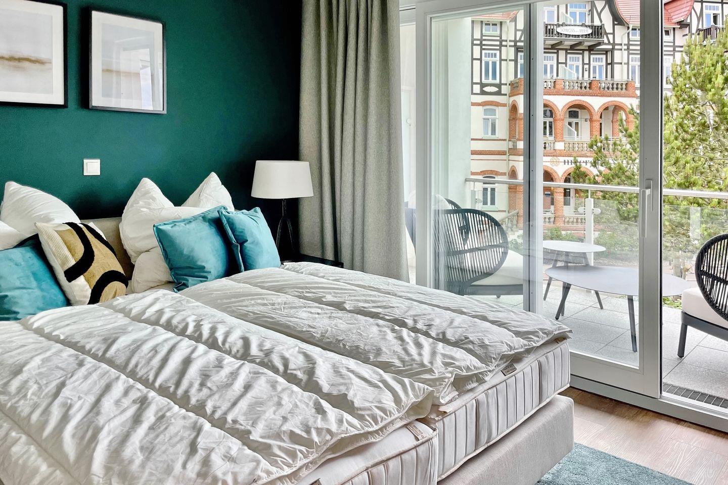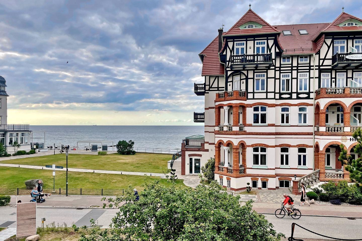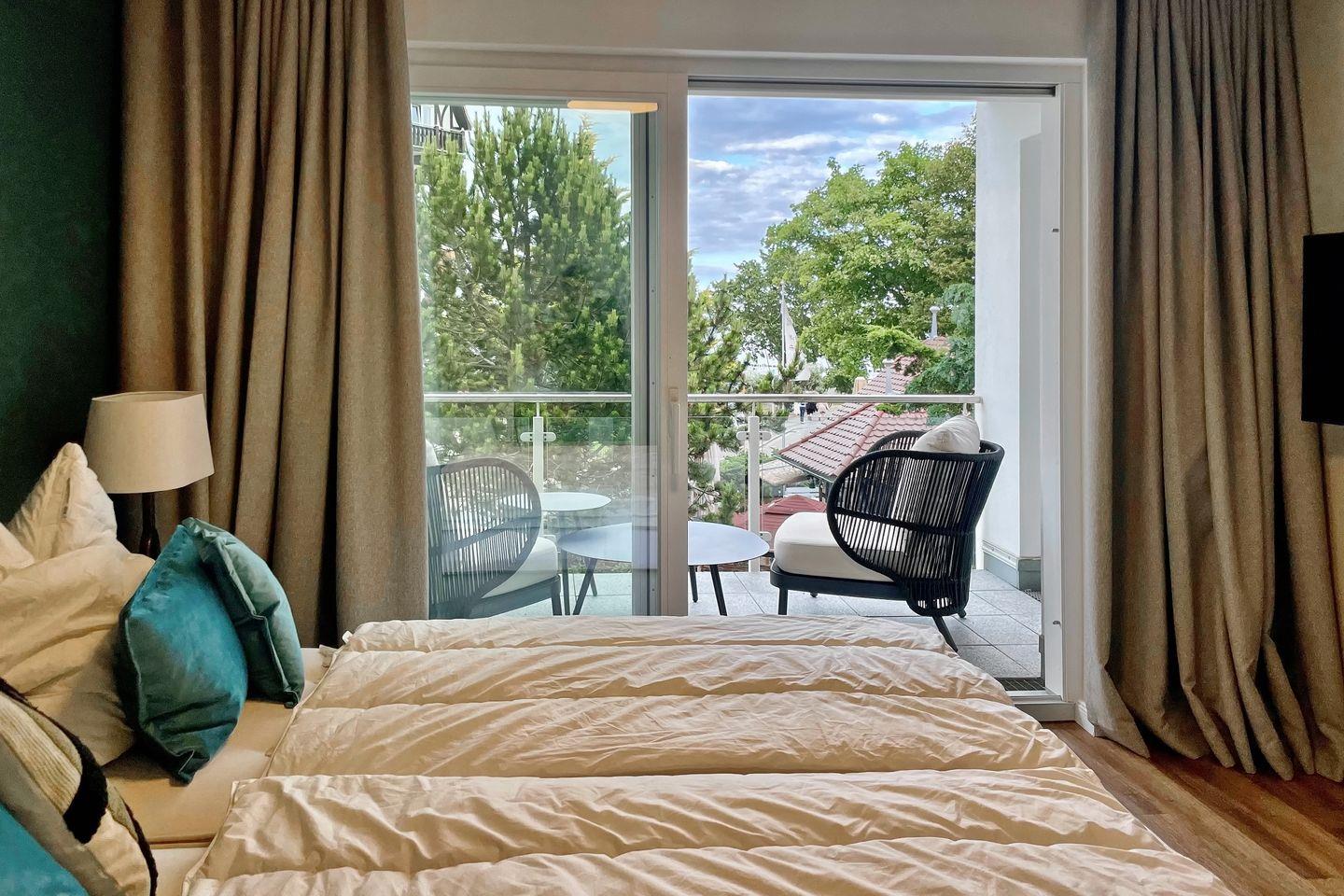 Genieße die frische Ostseeluft und einen herrlichen Seeblick vom Balkon mit Nord - Ost Ausrichtung und den modernen Loungemöbeln.